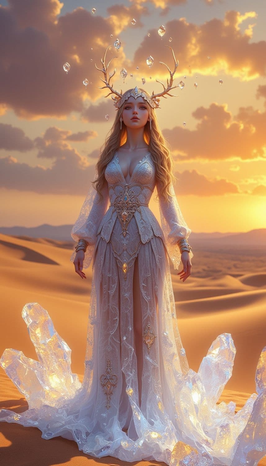 In a mystical, ethereal realm of floating, luminescent sand dunes under a sky painted with the colors of a golden sunset, a captivating female figure stands poised on a shimmering, translucent crystal platform. Her attire is a flowing robe crafted from a fabric that seems to capture the essence of desert twilight, blending shades of warm amber and shimmering silver. Her hair, a striking shade of sunset copper, cascades down her back in intricate, braided patterns, framing a face with delicate, serene features. Her eyes, a mesmerizing shade of desert gold, seem to reflect the mysteries of the vast, sandy expanse. She wears a delicate headpiece made of intertwining golden vines and tiny, luminescent citrines, enhancing her celestial and otherworldly presence. The background is a breathtaking scene of glowing dunes and gentle, golden streams of light that weave through the realm, creating a serene and enchanting atmosphere. The style is a blend of fantasy and desert elegance, with a focus on warm color tones and intricate detailing, creating a mesmerizing and otherworldly atmosphere.