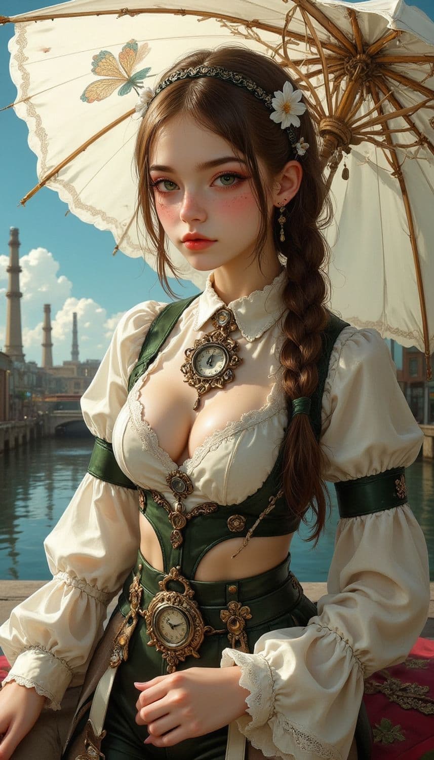 A beautifully styled woman stands under a sunlit parasol by a waterway. Her attire blends Victorian and steampunk influences, featuring elaborate embroidery and ornate clock-themed jewelry. Her hair is neatly braided with floral adornments, complementing the gentle blush on her cheeks. The setting showcases a clear blue sky with towering structures in the background, evoking an atmosphere of grace and elegance.