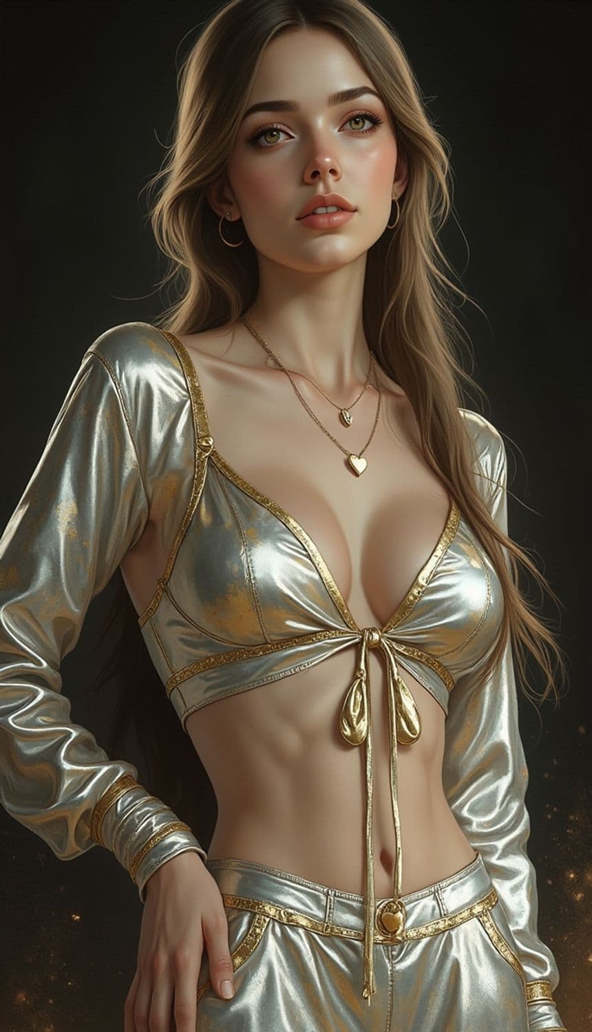 The image features a woman with long hair and subtle makeup, dressed in a shimmering silver top and pants with gold accents. She wears layered necklaces with heart pendants and gold hoop earrings, exuding a modern and elegant style against a dark background.