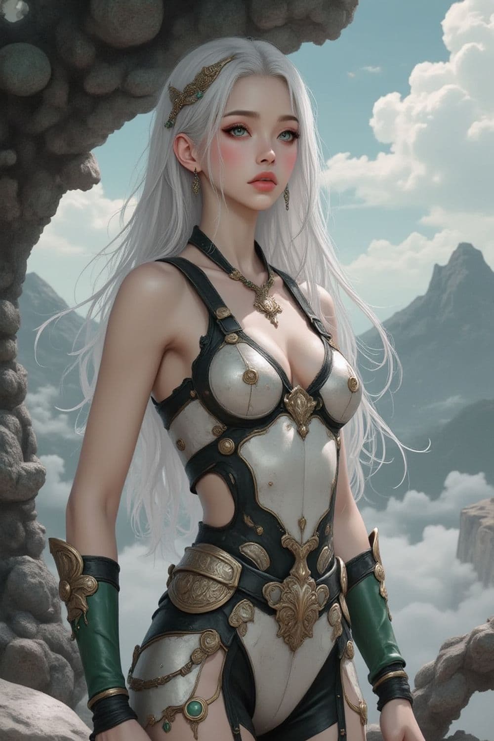 A fantasy-themed illustration of a woman with long, flowing white hair, standing in a mountainous landscape. She is adorned in intricately designed armor in gold and green, featuring ornate details and gemstones. The background shows a cloudy sky and distant mountains, adding an ethereal quality to the scene.