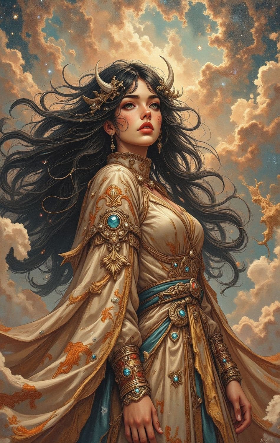 A mystical woman stands against a celestial backdrop of swirling clouds and stars. She has flowing dark hair adorned with gold crescent-shaped horns. Her attire is regal, featuring intricate gold embroidery and inlaid blue gemstones. The scene combines elements of fantasy and elegance.