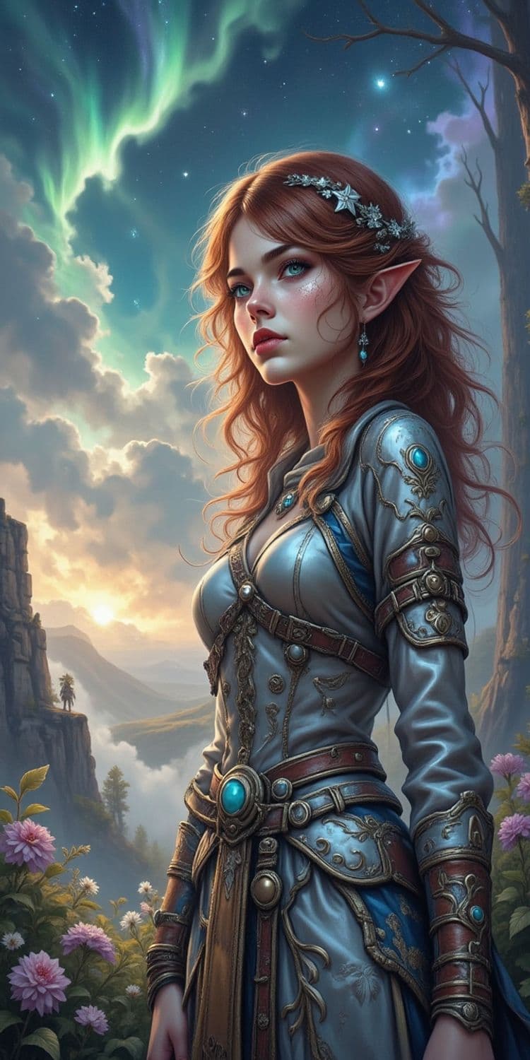 A fantasy character stands in a scenic landscape with the Northern Lights illuminating the sky. She has pointed ears, suggesting an elfin or mystical nature. Her auburn hair is adorned with a delicate silver tiara. She wears an intricately decorated silver and blue armor with ornate patterns and blue gemstones. Behind her, the landscape is lush and mountainous, filled with blooming flowers, while the sky showcases vibrant green auroras.