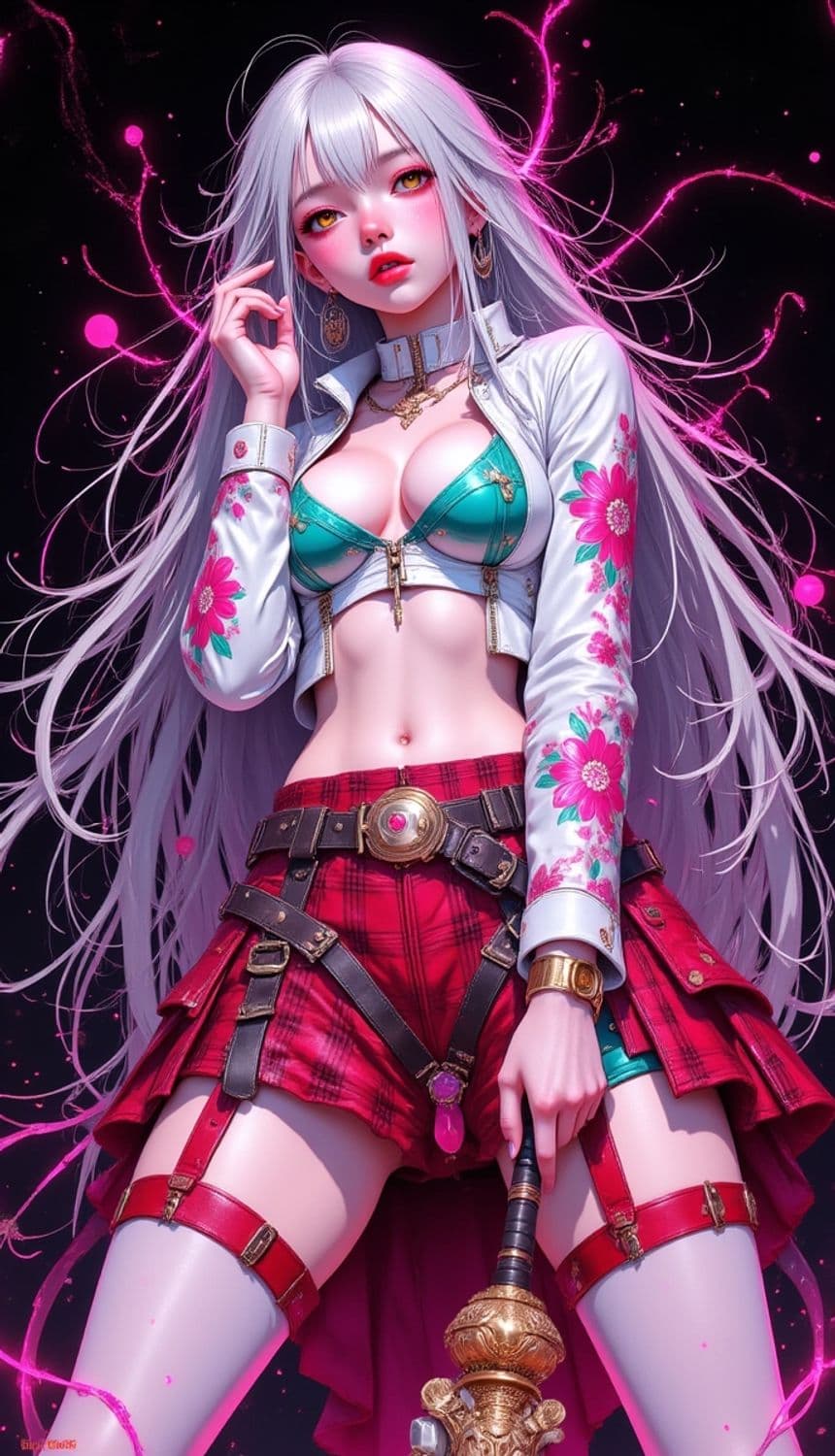 A captivating character with long, flowing silver hair stands confidently. Her striking yellow eyes and bold makeup enhance her mystical appearance. She wears a white jacket with floral patterns over a turquoise top, paired with a red plaid skirt and leather harness accessories. Her hand grips a mysterious staff, and vibrant pink energy swirls around her, adding a magical aura to the scene.
