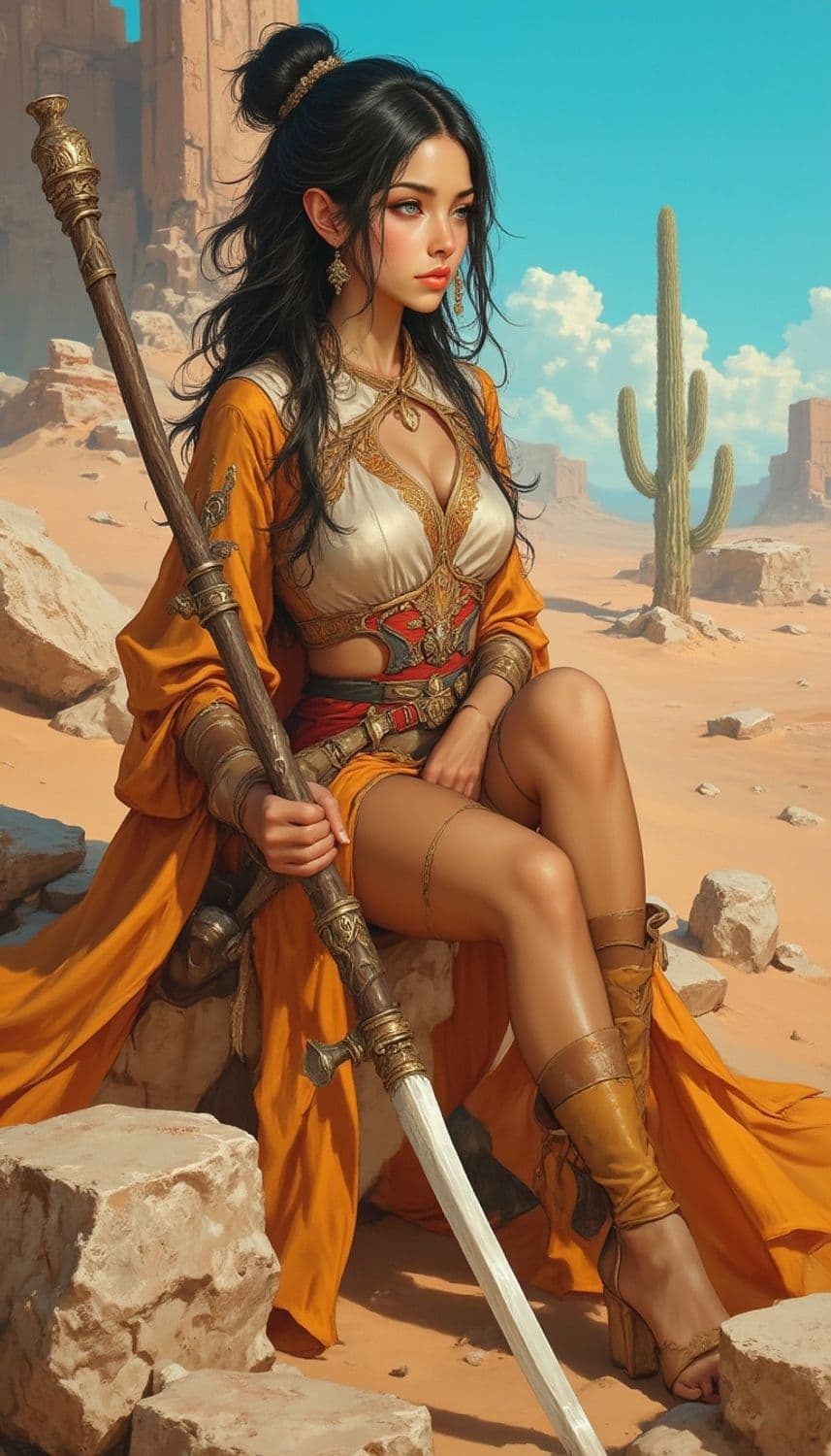 A striking portrayal of a woman seated in a desert landscape. She has long dark hair styled elegantly and wears intricate golden jewelry. Her attire is a blend of ornate gold and beige fabric with red accents, complementing her commanding presence. She holds a regal staff with an intricately designed handle, and a sword rests against her leg. The background features desert elements like rocks, a cactus, and clear blue skies.