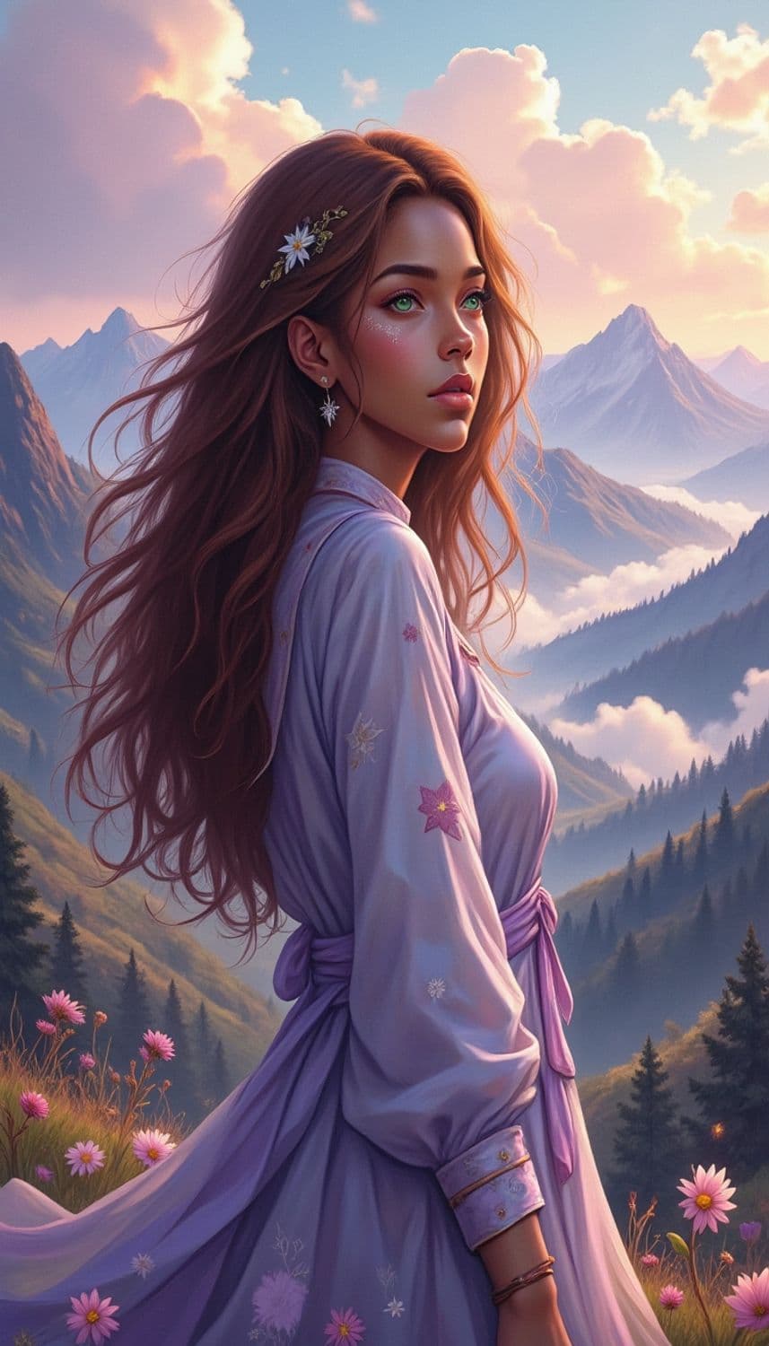 A young woman with long, flowing brown hair stands gracefully in a vibrant meadow, surrounded by blooming flowers. She wears a soft, purple robe adorned with subtle floral patterns. Her eyes are vivid green and her expression is serene, gazing towards a majestic backdrop of mountains and a sky filled with pastel-colored clouds.