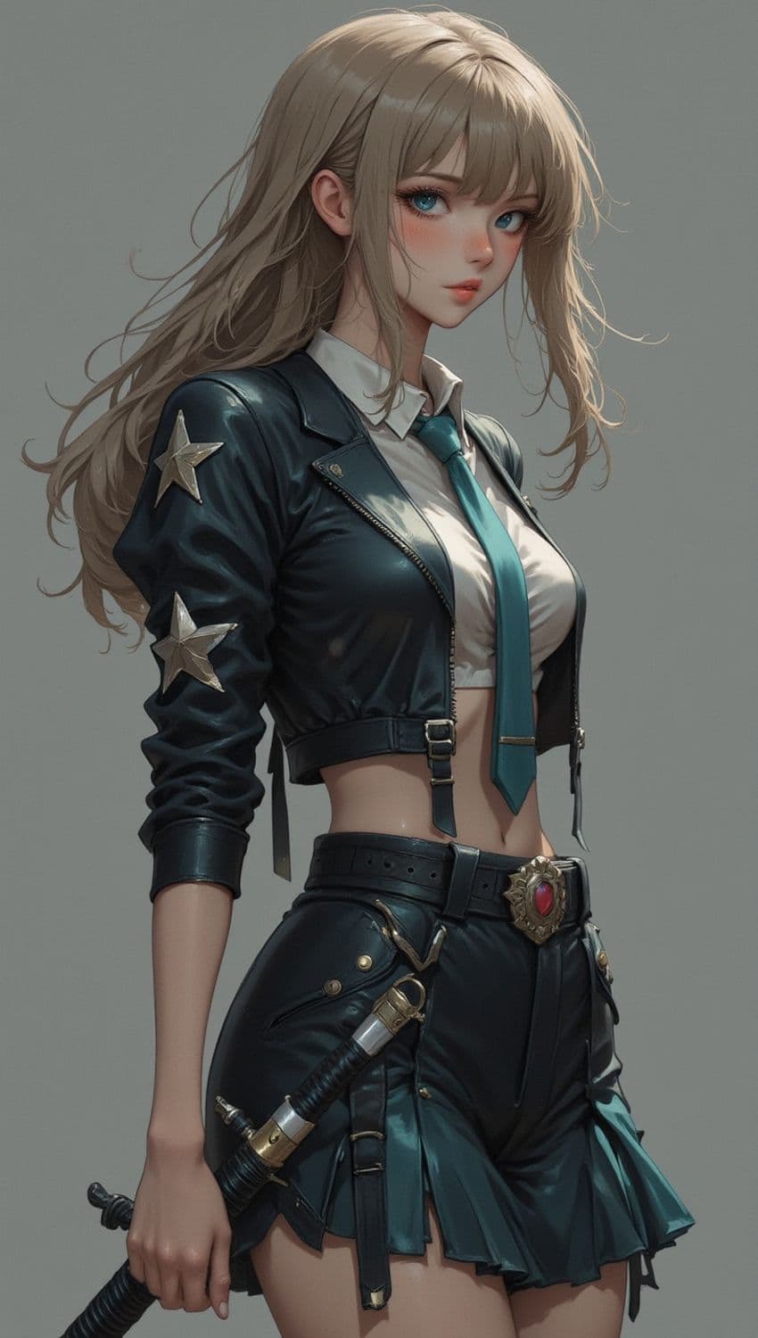 The image features a confident young woman with long, flowing blonde hair and striking blue eyes. She wears a stylish outfit consisting of a cropped black leather jacket adorned with silver stars on the sleeves, a white shirt, and a teal tie. Her high-waisted shorts with elaborate gold embellishments and a ruby-accented belt complete the ensemble. The woman holds a sword with a detailed hilt, exuding a sense of strength and elegance.