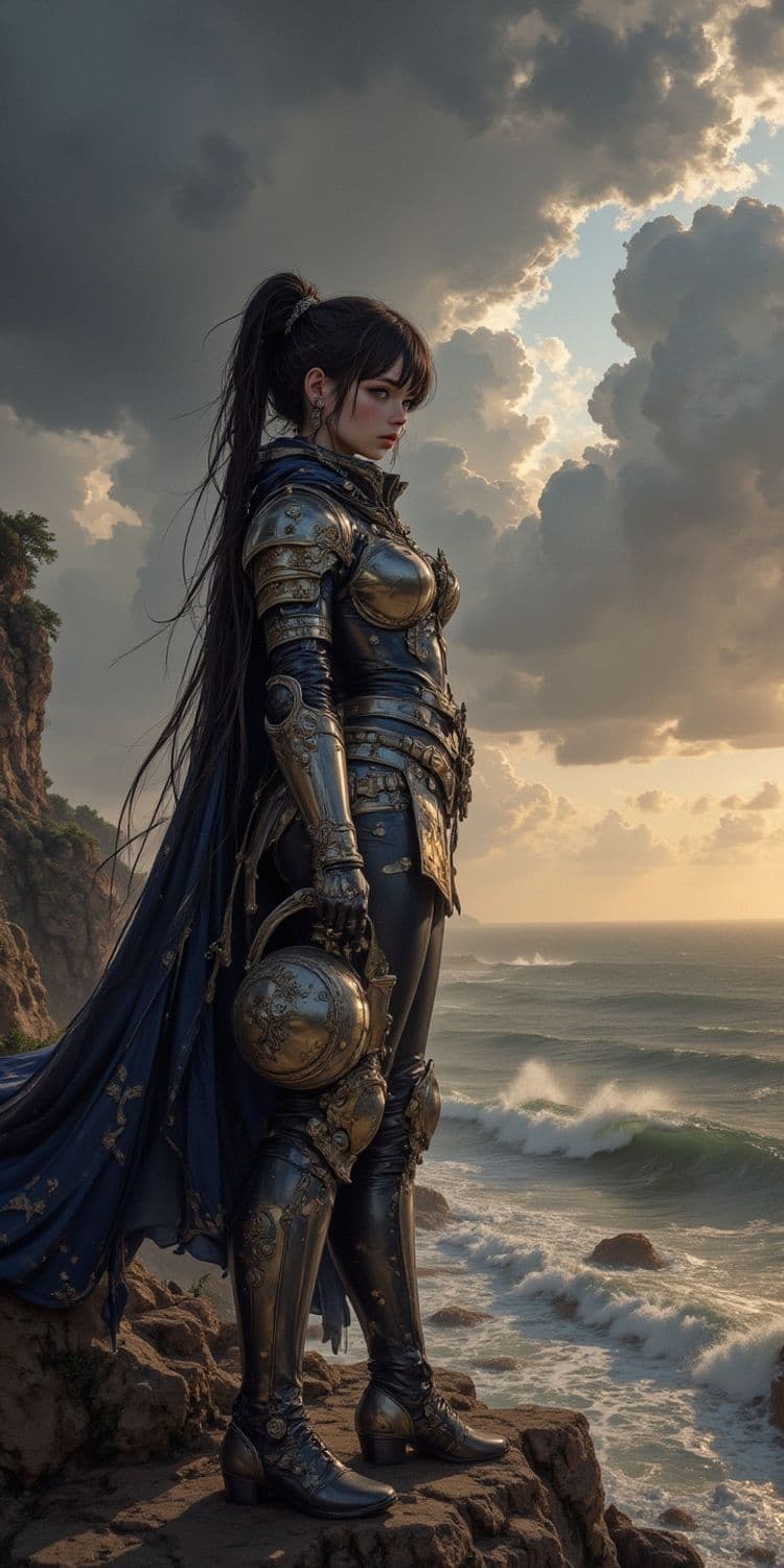 An armored figure stands majestically on a rocky cliff, overlooking a turbulent ocean. The figure wears elaborately detailed, artisan-crafted armor with gold accents, and a flowing blue cape. Clouds loom dramatically overhead, adding to the epic atmosphere. The scene captures a moment of stoic determination and strength.