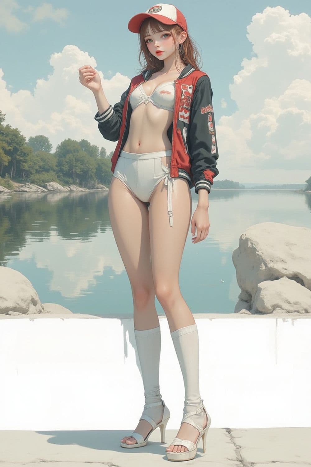 The image features a woman with an anime-style appearance. She has long hair and is wearing a red and black jacket over a white bikini. A red and white cap sits on her head, and she dons long white socks paired with high heels. She stands in front of a serene lake scenery, with trees and blue skies reflected in the calm water.