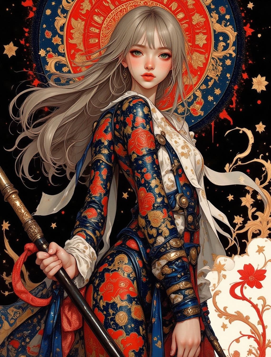 A captivating character stands poised with a staff in hand. She has long, flowing silver hair and an intense gaze, surrounded by an ornate circular backdrop in vibrant red and blue. Her intricate attire is adorned with golden and red floral patterns, exuding an aura of strength and elegance.