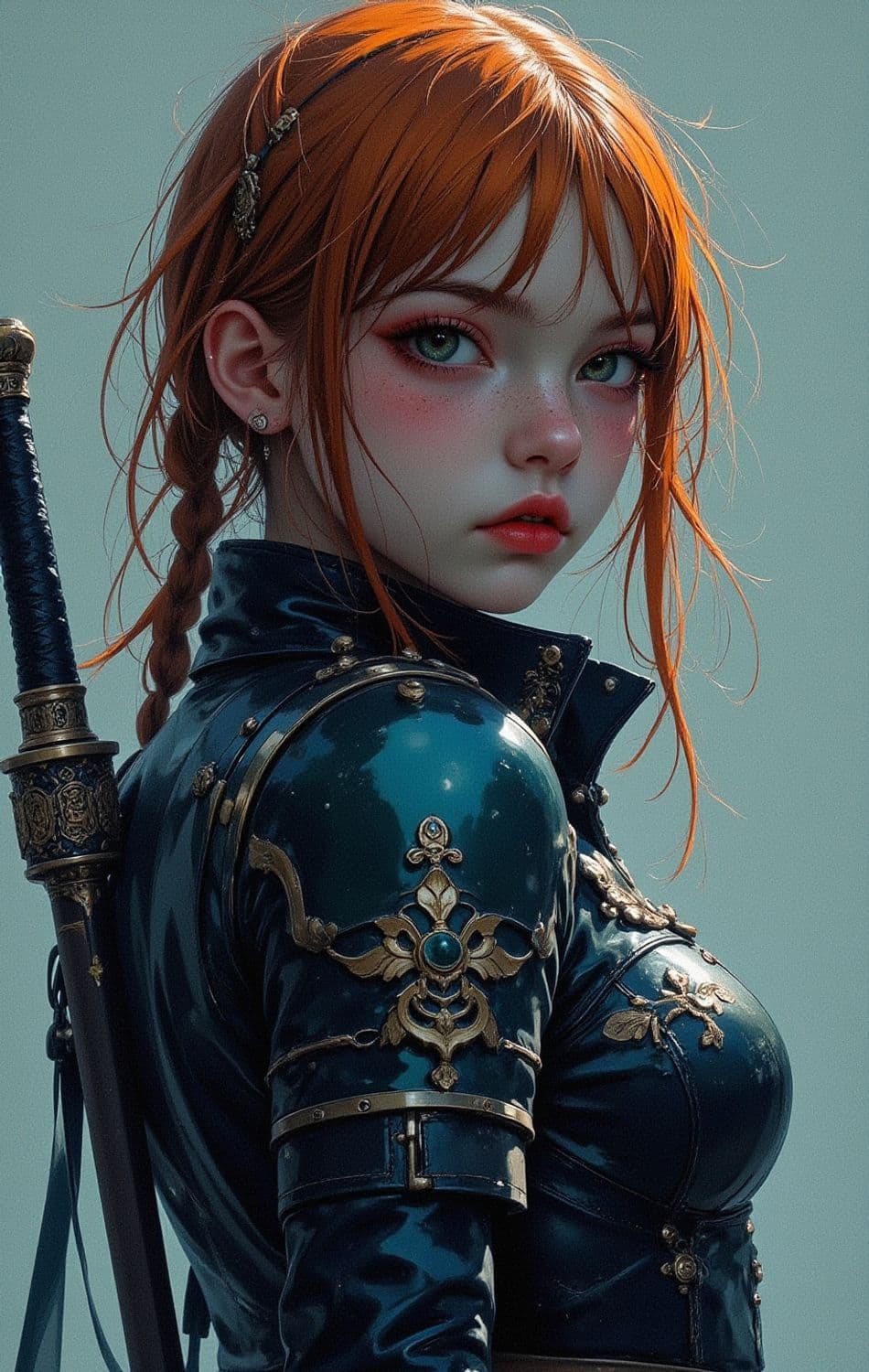 A striking warrior with fiery red hair stands confidently, her piercing green eyes set against a delicate, freckled complexion. She is clad in an ornate, dark teal armor adorned with intricate gold embellishments, exuding a medieval and mystical aura. A finely crafted sword is sheathed on her back, complementing her poised and ready stance.