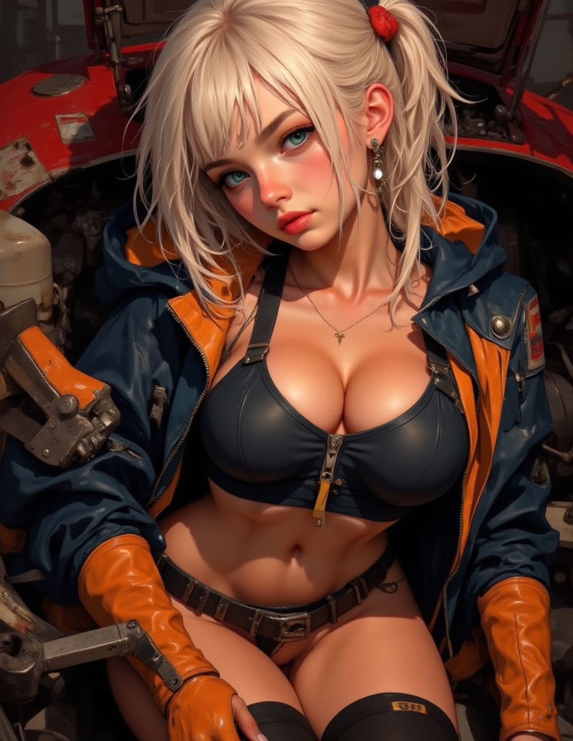 A striking illustration features a young woman with platinum blonde hair styled in a ponytail, accented by a red hair tie. Her large, blue eyes and rosy cheeks add to her striking appearance. She wears a navy and orange jacket, open to reveal a black top secured with a zipper, paired with a leather belt. She adorns herself with a dangling earring and a delicate necklace, set against the backdrop of machinery and metal parts.