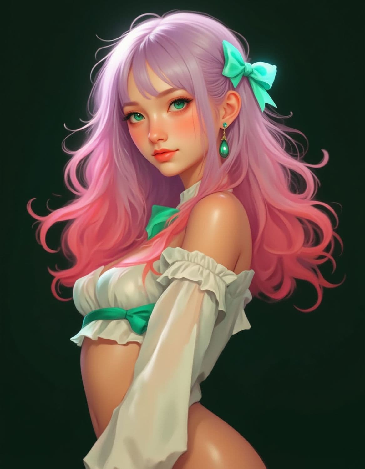 A digital illustration of a young woman with pastel purple and pink hair adorned with teal bows. She has striking green eyes and is wearing a white outfit with teal accents. Her complexion is soft with a subtle blush, and she wears a matching green teardrop earring. The background is a dark, contrasting shade that highlights her vibrant features.
