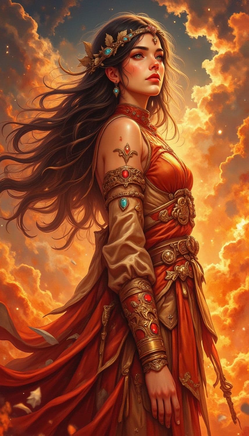 A portrait of an ethereal woman standing against a backdrop of glowing clouds. She wears a flowing, ornate orange gown with gold embellishments and intricate jewelry, including a crown of leaves and gemstones. Her long, dark hair cascades elegantly around her, and the warm colors create a sense of regality and mystique.