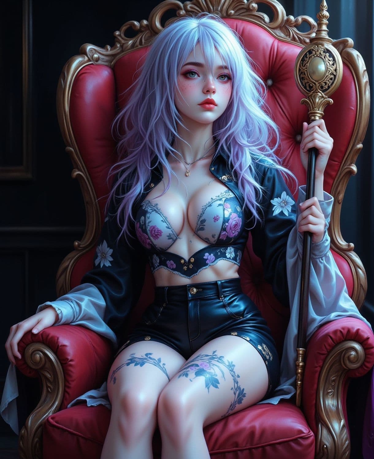 A fantasy-themed artwork featuring a woman with long, flowing lavender hair seated on a richly decorated red and gold throne. She is holding a golden staff with an ornate design. Her outfit is a combination of a floral-patterned top and black high-waisted shorts, with detailed tattoos on her thighs. Her expression is calm yet commanding, with a soft light illuminating her figure in a dark, elegant setting.