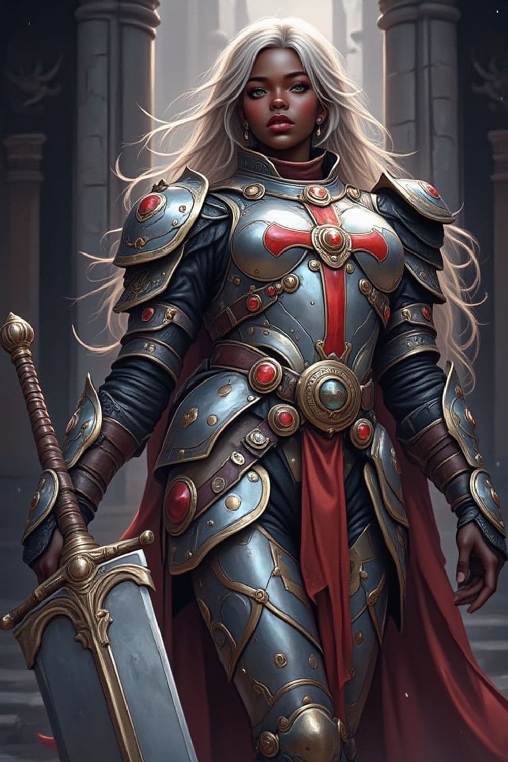 A powerful warrior stands confidently in ornate armor. Her armor is intricate, featuring metallic hues with red accents and adorned with gemstones. She carries a large sword, exuding strength and readiness. Her white hair flows down her shoulders, set against the backdrop of a grand architectural setting featuring pillars.