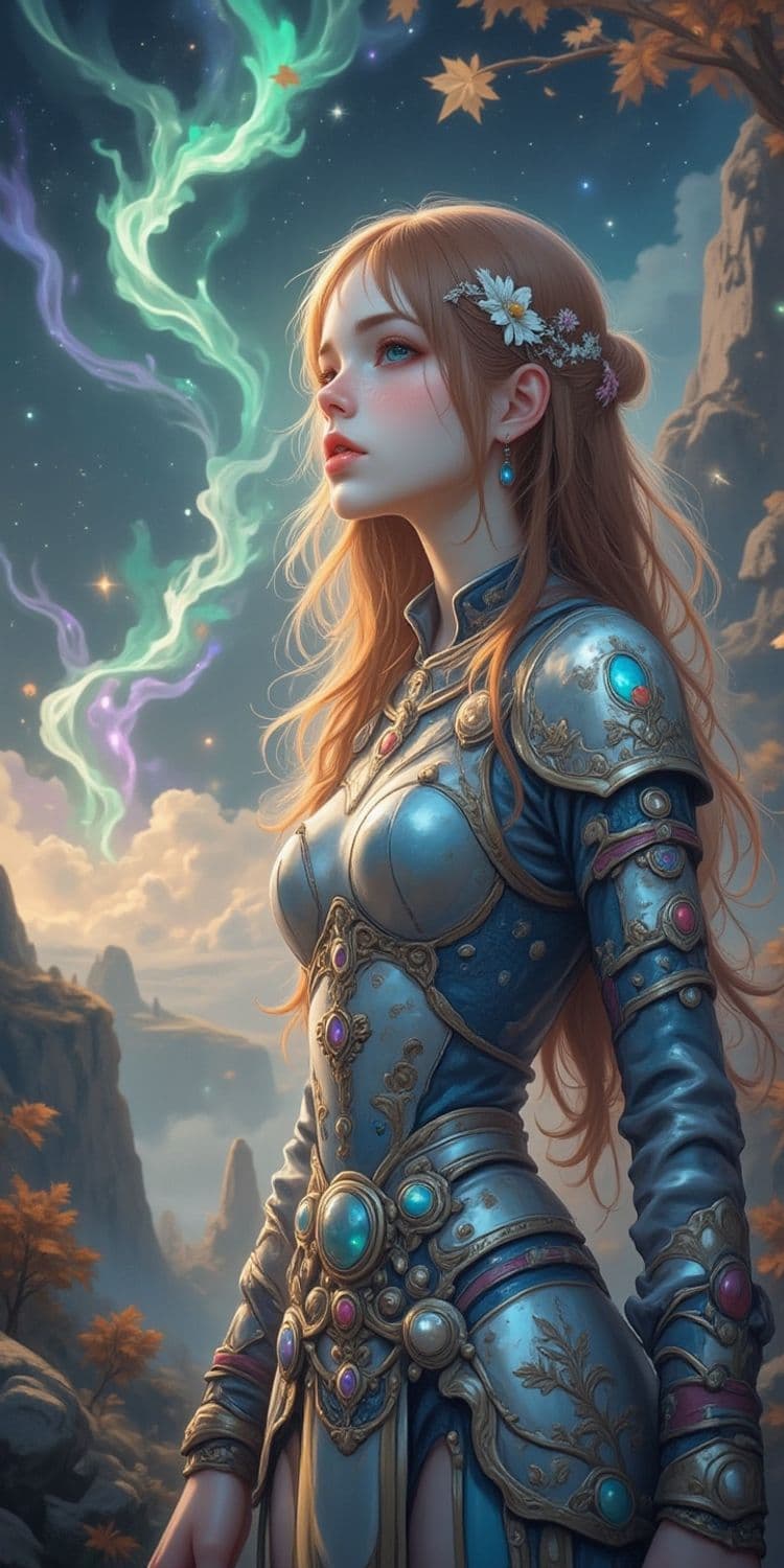A mystical female figure stands in an enchanting landscape. Her long hair is adorned with delicate flowers, and she wears intricately designed armor that features luminous gems. In the background, a swirling aurora of green and purple lights illuminates a starry sky, adding a touch of magic to the rocky landscape.