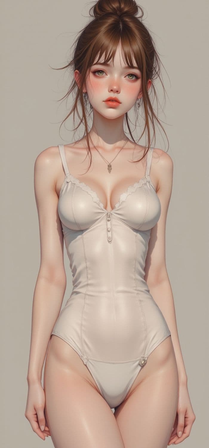 A digital artwork of a young woman with a delicate, porcelain-like complexion and soft blush on her cheeks. Her hair is styled in a loose, elegant bun with strands gently framing her face. She wears a fitted, cream-colored bodysuit accented with lace, emphasizing her graceful appearance. Her lips are painted in a subtle coral hue, adding a touch of warmth to her overall look.