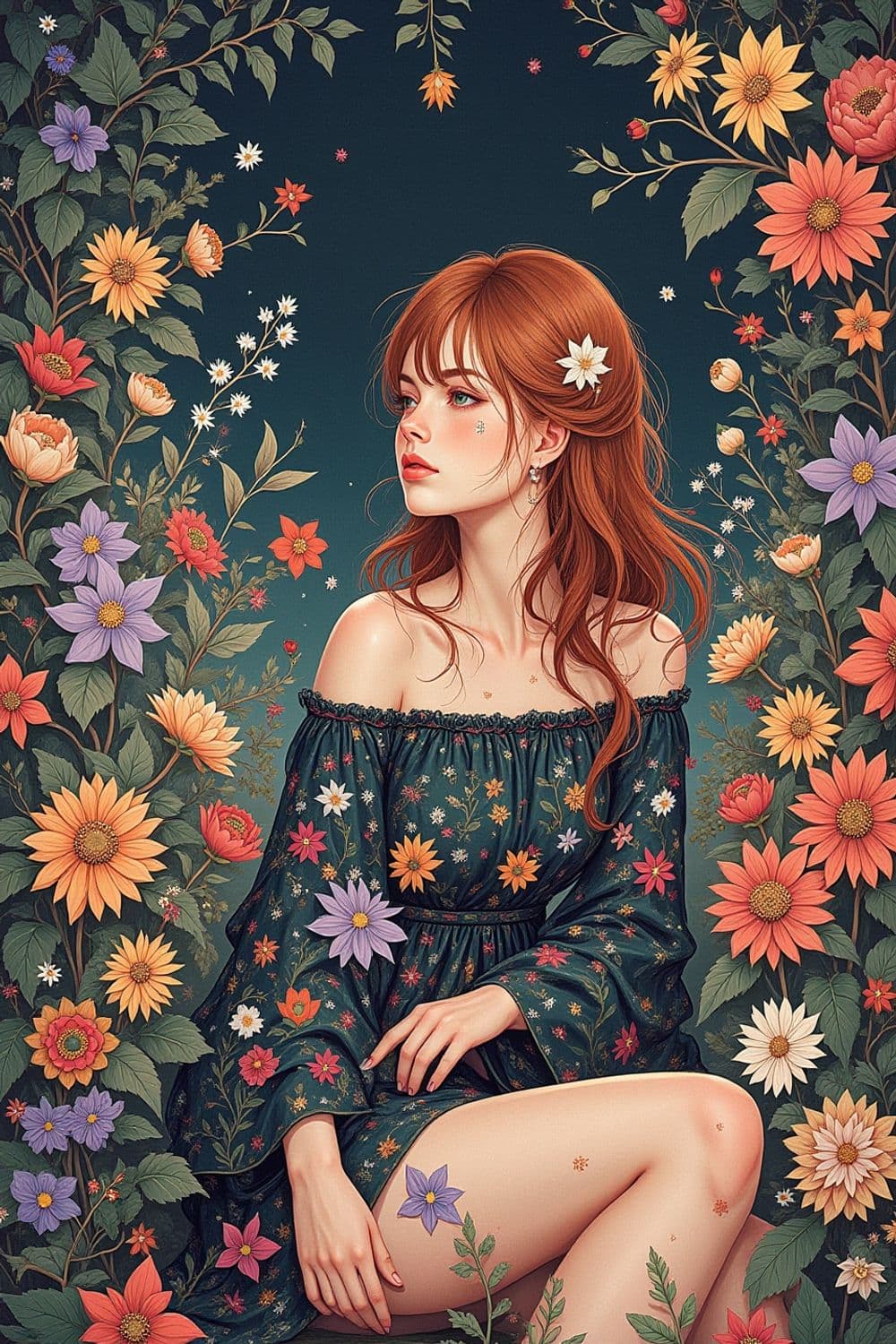 A serene portrayal of a woman with auburn hair adorned with a white flower, surrounded by a lush array of colorful blossoms. She wears a dark floral dress and is set against a rich emerald backdrop filled with intricate floral patterns.