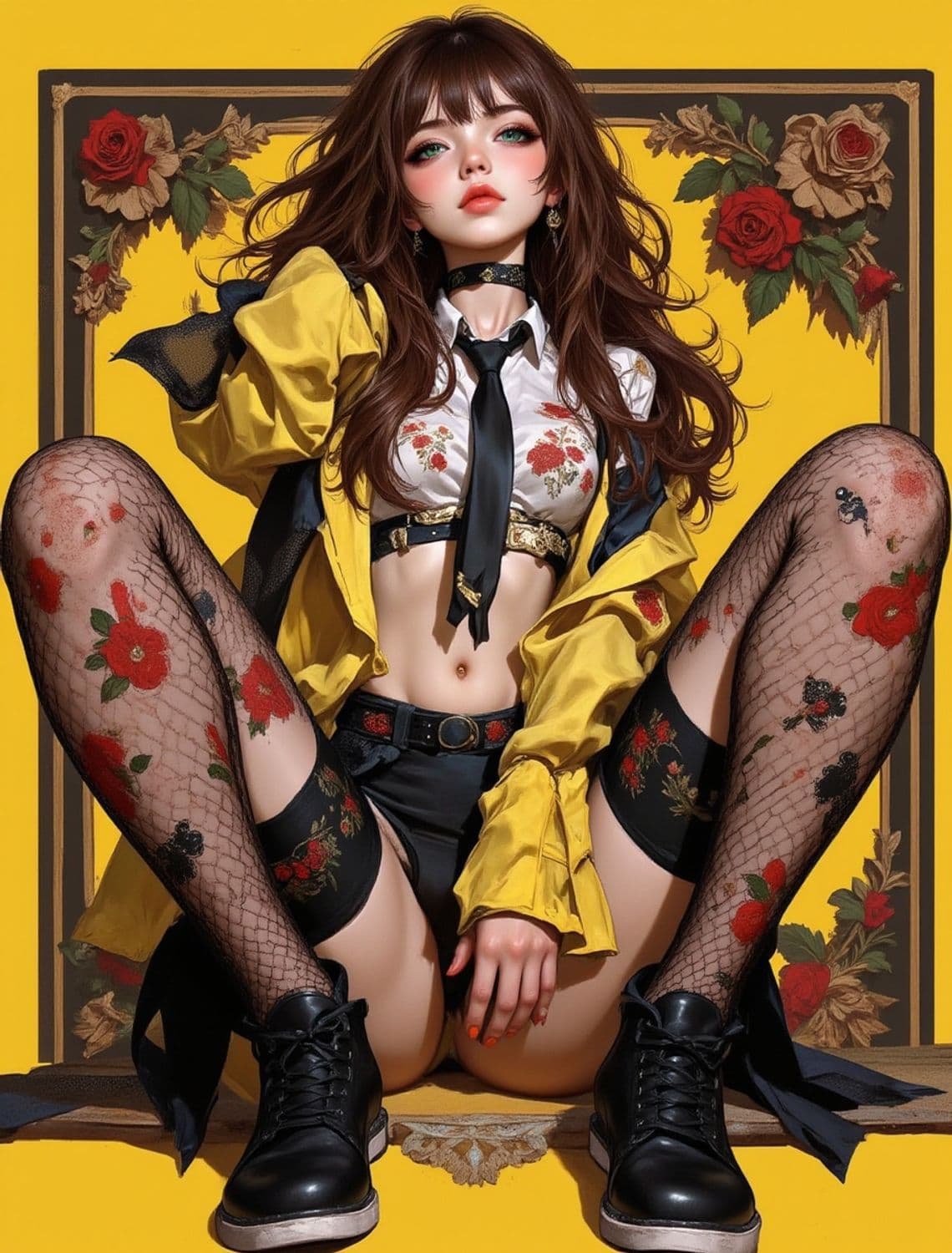 The image showcases an anime-style character set against a mustard yellow background with floral patterns. The character has long brown hair, vibrant green eyes, and wears a floral-patterned crop top with a black tie. A bright yellow jacket drapes over her shoulders, complementing her attire. Fishnet stockings adorned with red floral designs and black boots complete her look. The character's pose is confident, exuding a mix of style and attitude, matching the vibrant and artistic backdrop.