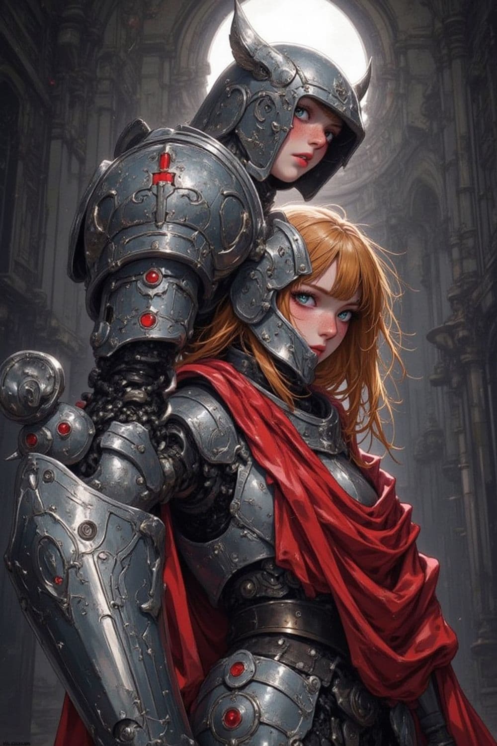 This is an image of two armored female warriors standing together in an ornate, ancient-looking hall. Their armor is intricately designed with metallic textures and adorned with red gemstones. One warrior has red hair that contrasts with her steely armor, while a red cape adds a striking element to their ensemble. The composition is dramatic, with a circular window casting light onto the pair.