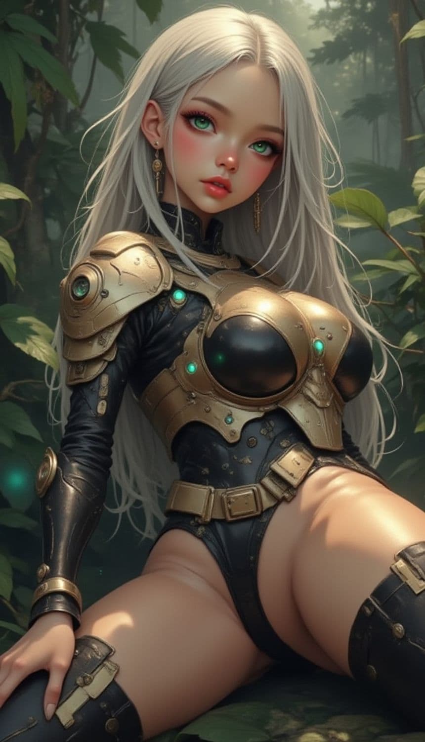 A striking character with long, flowing silver hair and vibrant green eyes sits confidently amidst lush greenery. She is adorned in intricate gold and black armor that glows with soft green lights, highlighting her ethereal presence. Her expression is poised, adding to the sense of mystery and strength.