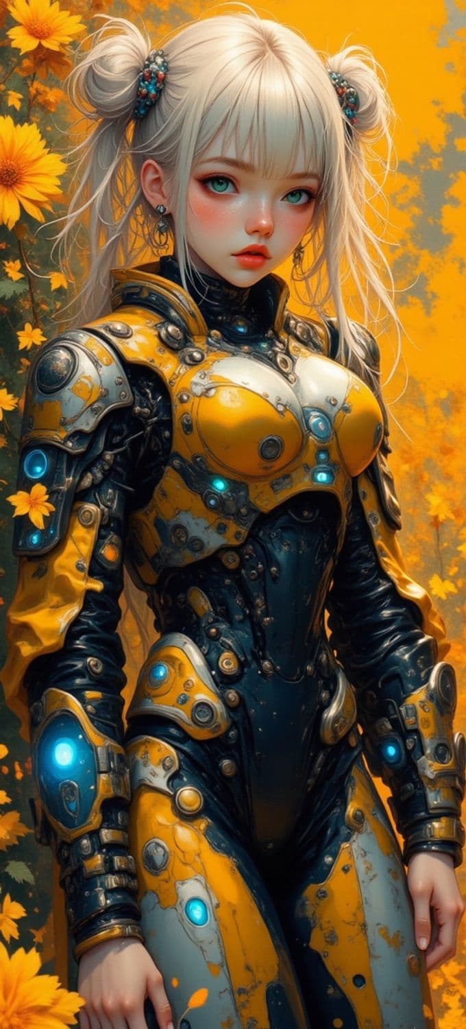 A futuristic female character with blonde hair tied in twin buns stands confidently in a vibrant yellow and black armored suit adorned with glowing blue tech elements. She is set against a background of bright yellow flowers, creating a striking contrast between nature and technology.