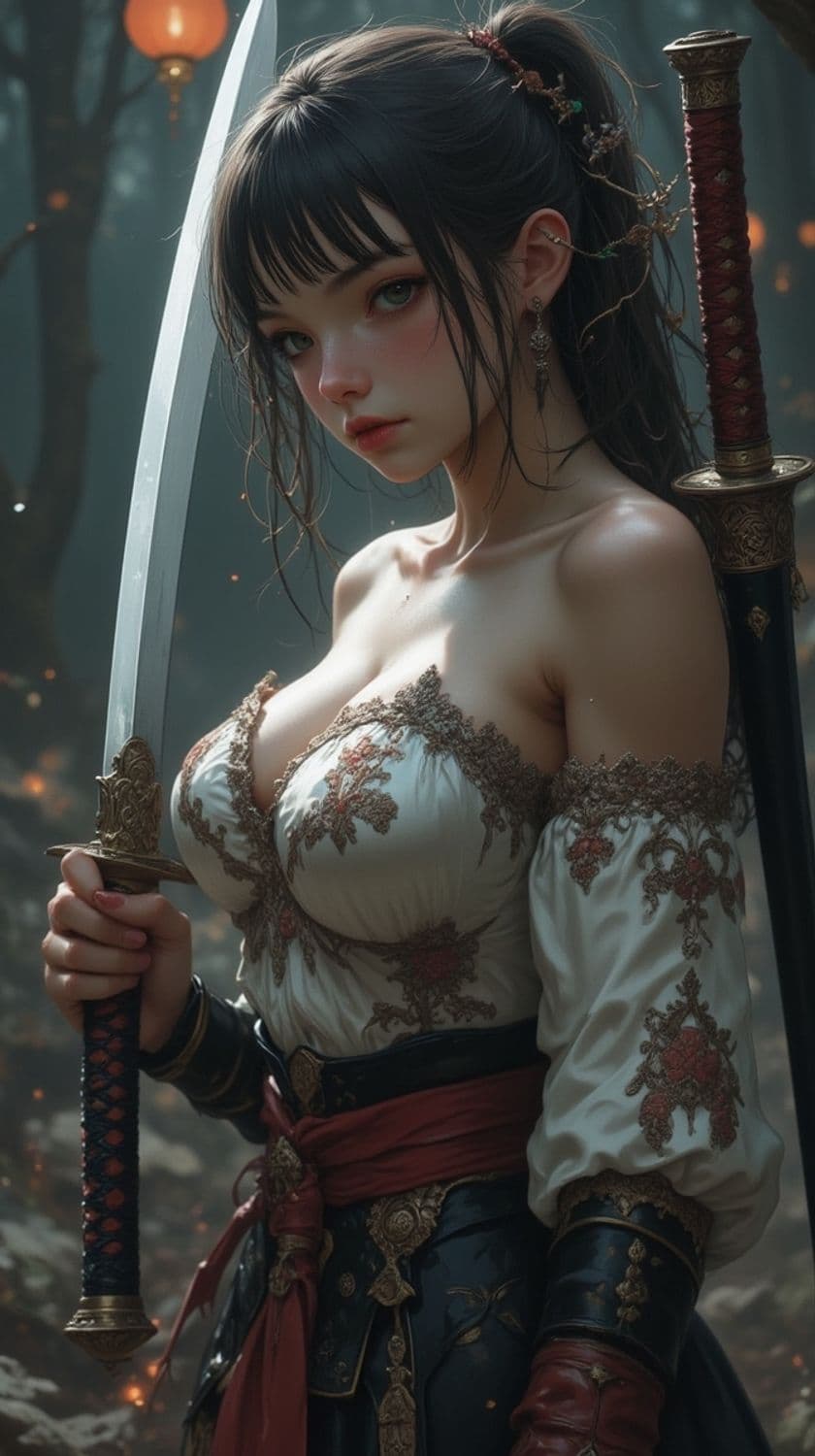 A warrior maiden stands confidently in a mystical forest. She holds a sword with an ornate hilt, ready for battle. Her attire is intricately detailed with embroidered patterns and a decorative belt. Lanterns glow softly in the background, adding an ethereal ambiance.