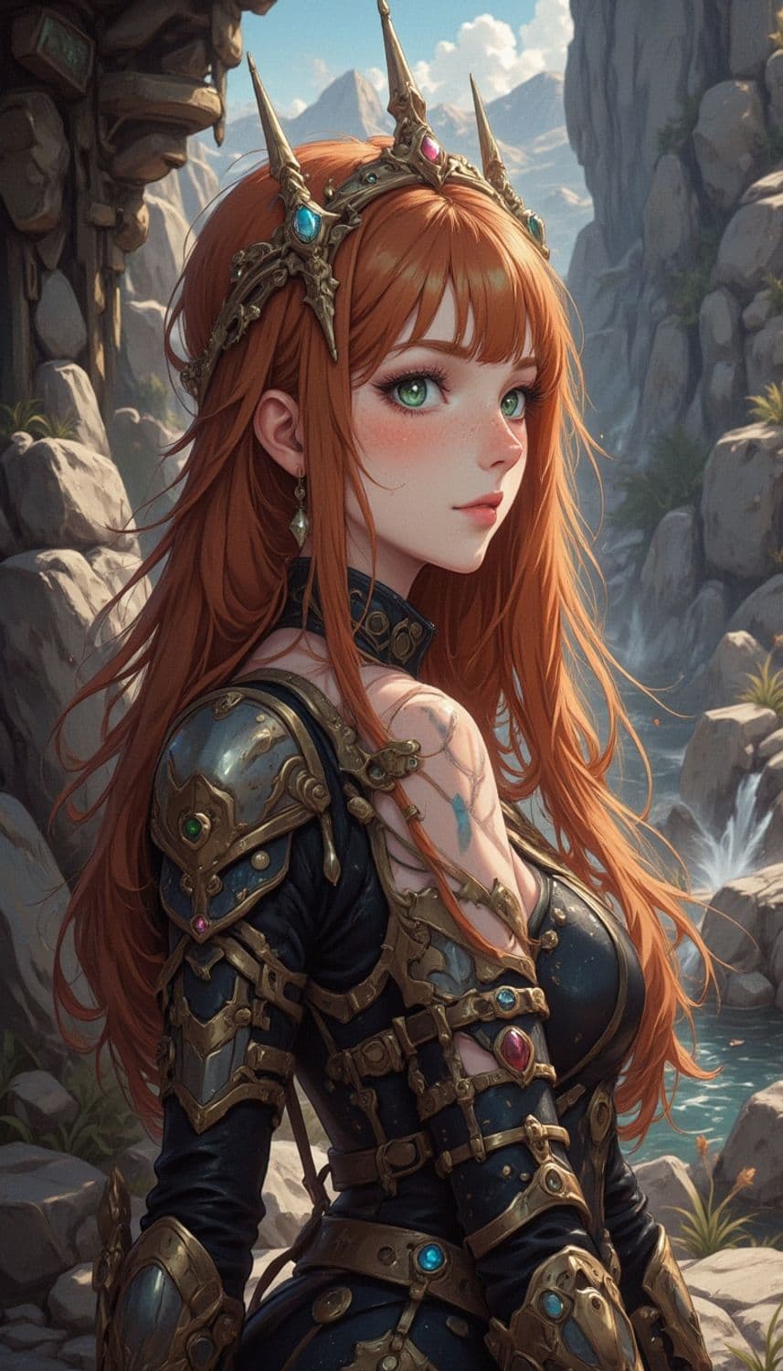 A young female warrior with striking red hair stands confidently against a mountainous backdrop. She wears intricate golden armor adorned with colorful gemstones and a matching crown with sharp points. Her green eyes and elegant posture give her an air of regal strength. The scenery behind her is filled with rocky cliffs and a gentle waterfall.