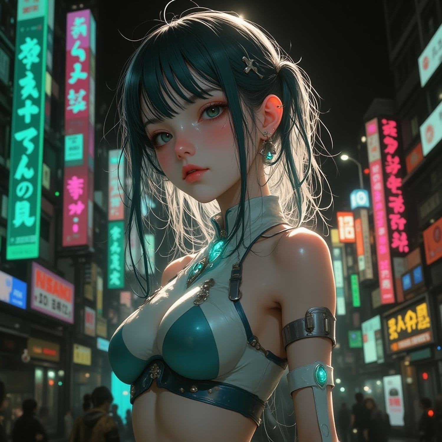 A futuristic character with striking blue hair and vivid green eyes stands amidst a vibrant cityscape adorned with neon signs. She wears a sleek, metallic outfit accentuated with glowing elements and intricate jewelry, exuding a blend of elegance and cybernetic sophistication.