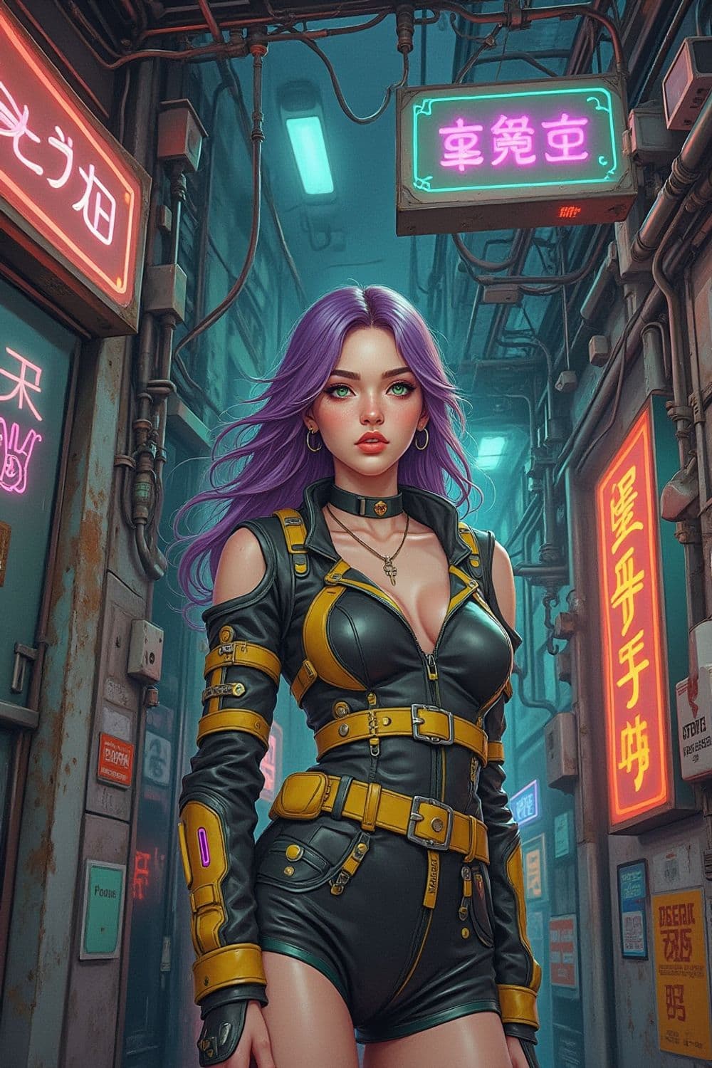 The image depicts a futuristic urban scene with neon signs in an alleyway. A confident woman stands in the center, with vibrant purple hair and wearing a sleek, form-fitting black and yellow outfit that is reminiscent of a sci-fi or cyberpunk aesthetic. The setting conveys a vibrant, energetic atmosphere with detailed background elements like wires and signs in various languages.