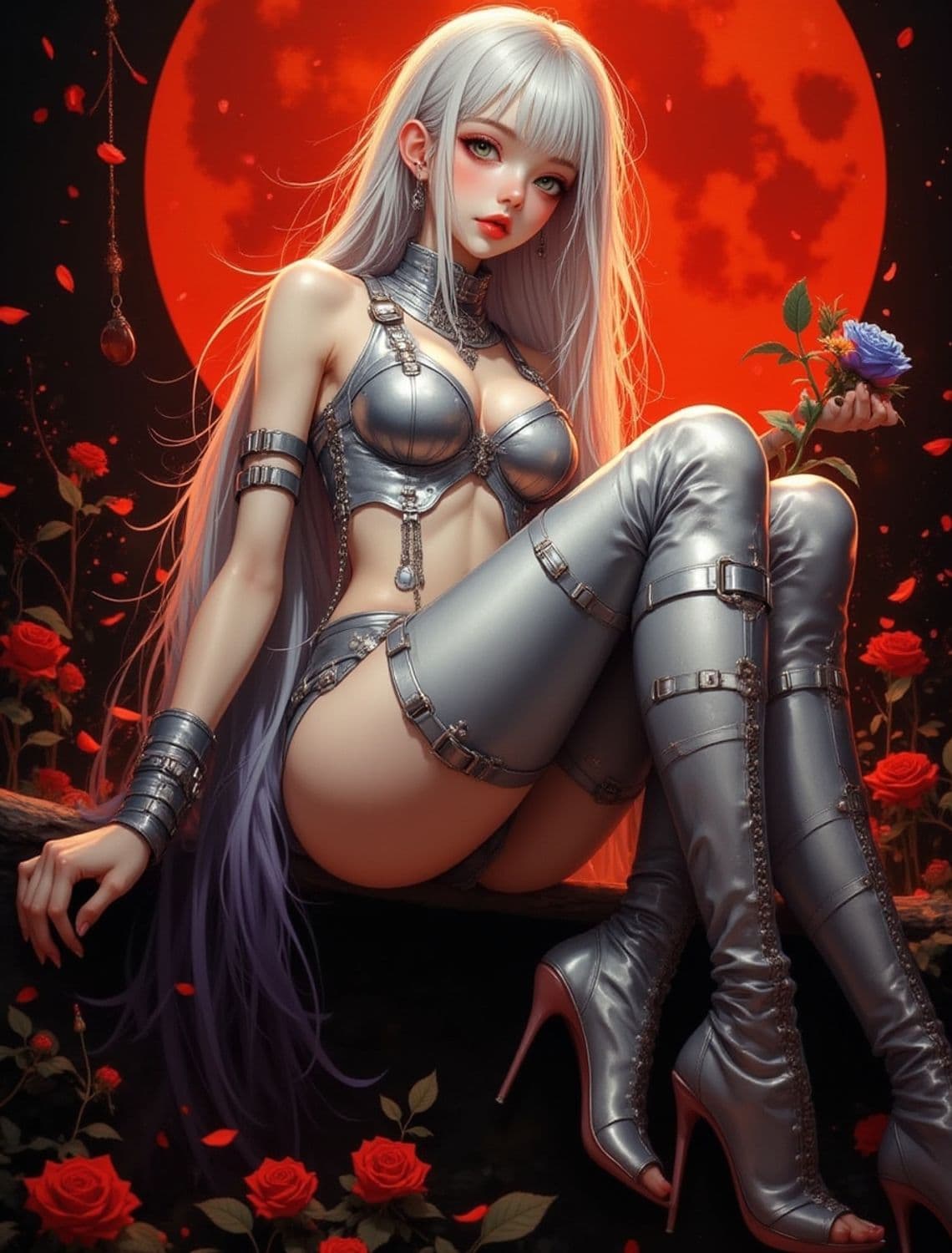 A fantasy-like character with long, silver hair sits against a luminous red moon. The character is dressed in a metallic outfit consisting of a bra and high boots, expressing a futuristic and mystical aura. Surrounding her are vibrant red roses and petals that add to the romantic and alluring atmosphere. She holds a blue rose delicately in her hand, contributing an element of mystery to the image.