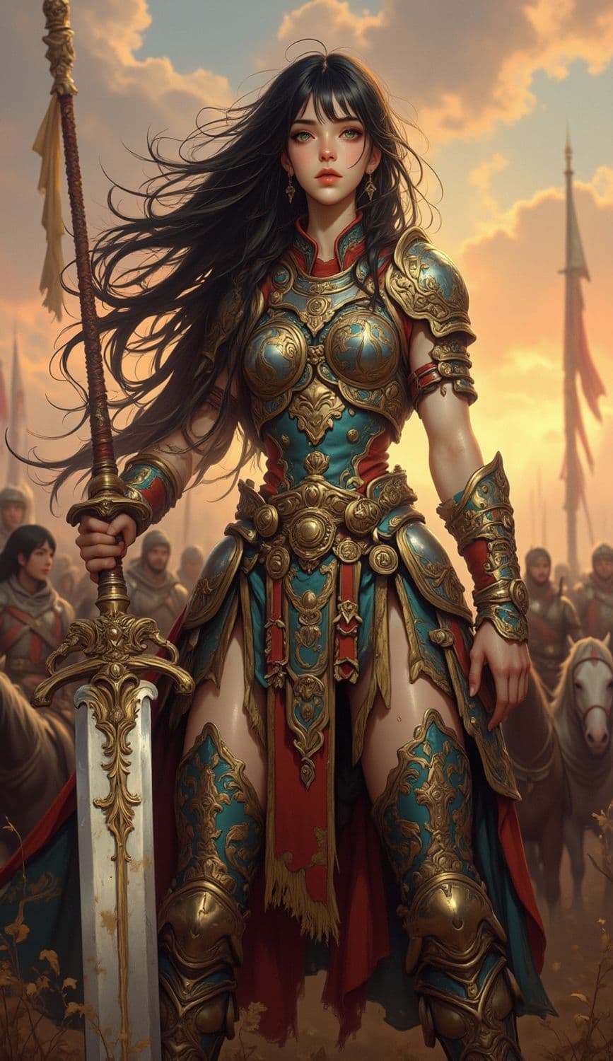 The image depicts a warrior woman clad in intricately detailed armor with gold accents. She stands confidently, holding a large, ornate sword, with a determined expression. Behind her, a group of soldiers on horseback can be seen, suggesting a battle-ready scenario. The sky is a warm hue, adding a dramatic backdrop to the scene.