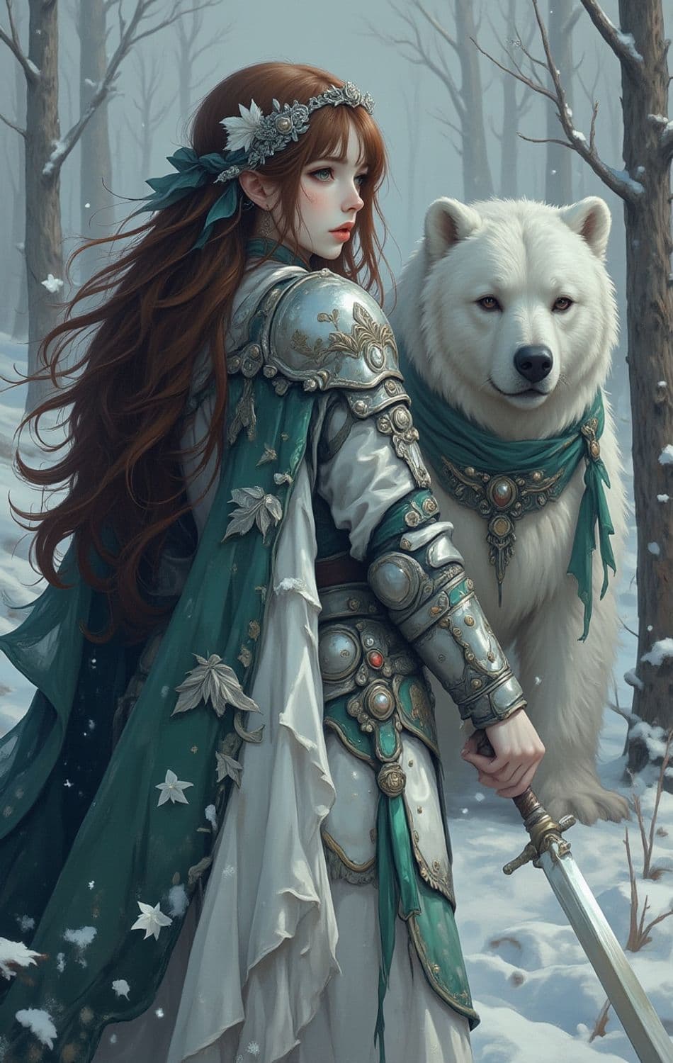 A serene, wintry scene featuring a young woman with flowing auburn hair adorned with a floral crown and a noble expression. Her finely detailed armor is embellished with intricate leaf patterns, including a flowing green and white cloak. She holds a sword, while standing beside a large, regal white bear, both surrounded by a quiet, snowy forest.