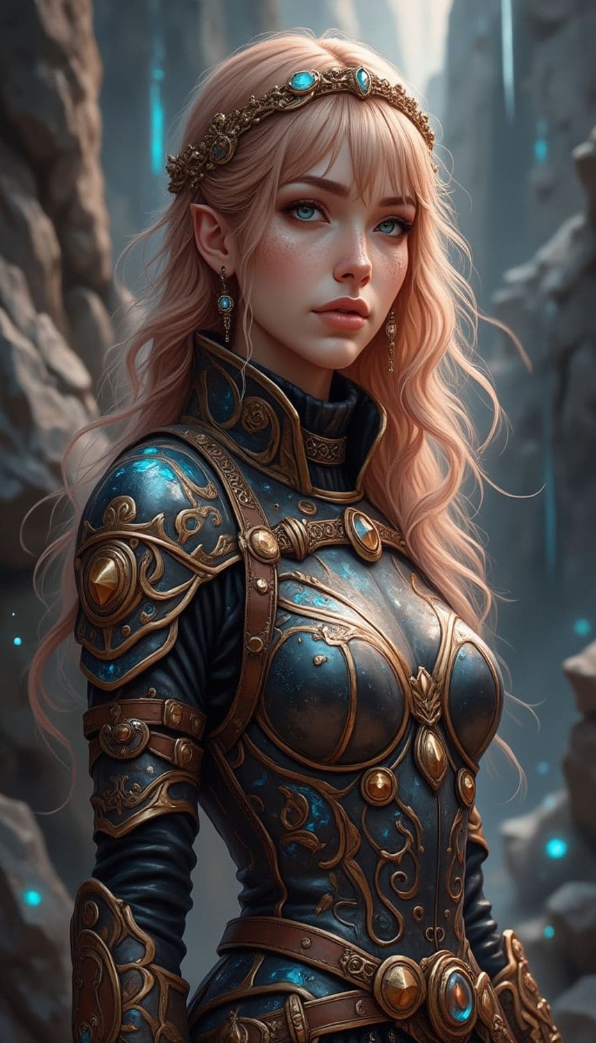 A mystical warrior stands in a rugged, rocky landscape. Her golden hair cascades down her shoulders, and she wears a detailed, ornate armor in shades of blue and gold. The armor is adorned with intricate patterns and gemstones, matching the tiara resting on her head. Her gaze is focused and determined, exuding a sense of strength and wisdom.