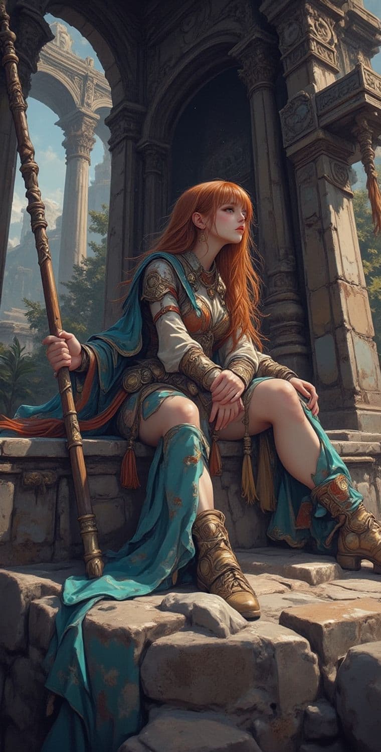 A serene female warrior sits on ancient stone steps amidst classical ruins. She has long, red hair and wears elaborately detailed armor with blue and gold accents. A staff rests at her side, adding to her air of nobility and strength. The backdrop features grand, weathered arches and lush greenery.