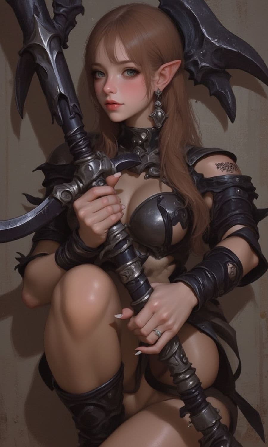 A fierce and mystical female warrior adorned in dark, ornate armor, with elongated ears and piercing eyes. She wields an intricately designed weapon, suggesting a mythical or fantasy setting. Her expression is both intense and ethereal, complemented by the detailed craftsmanship of her armor and accessories.