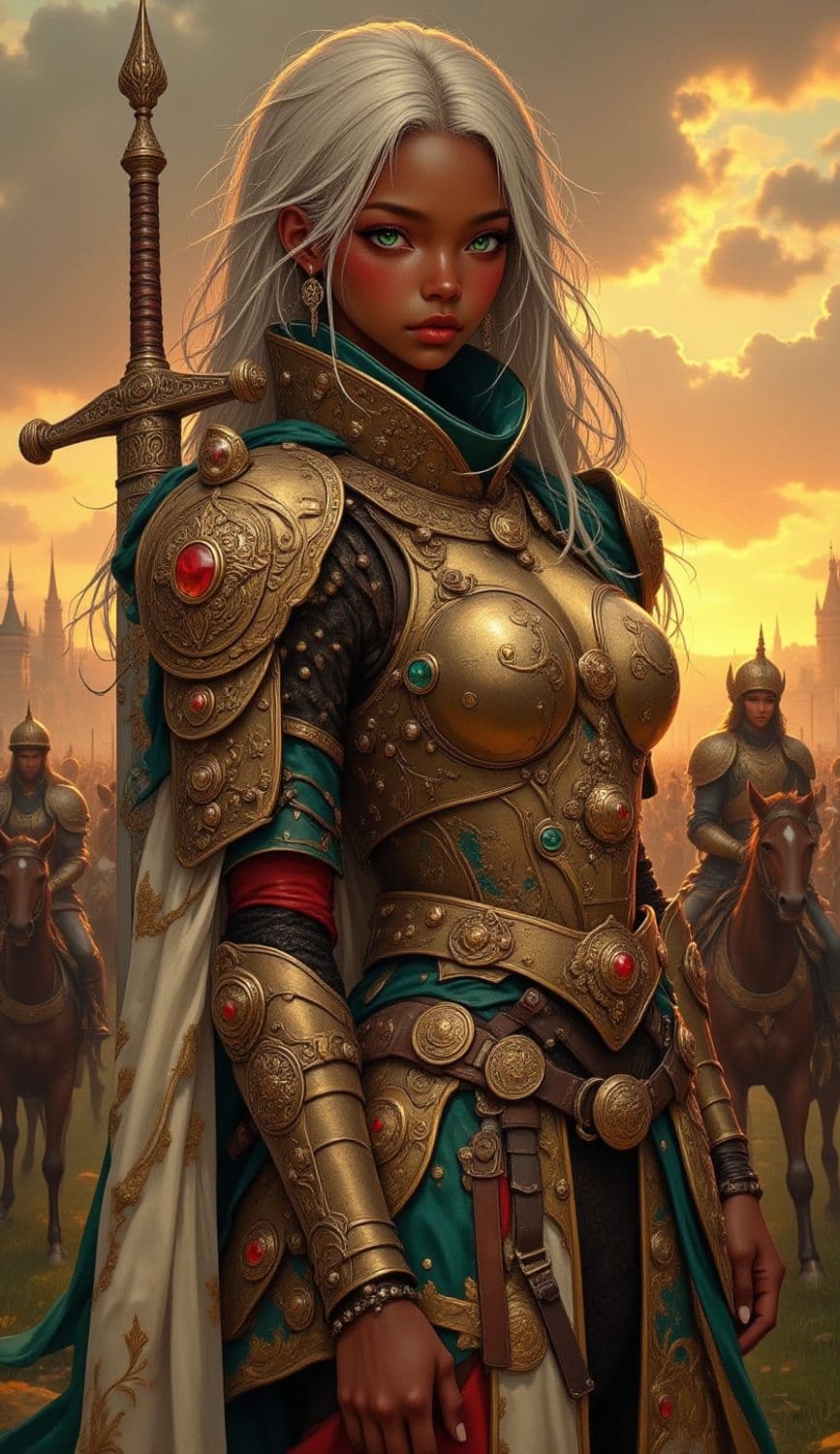 The image showcases a striking warrior adorned in intricate golden armor with detailed red and green embellishments. Her flowing white hair contrasts against the warm, sunset-lit sky. She stands confidently on a battlefield, with soldiers on horseback in the background, adding a sense of readiness and valor to the scene.