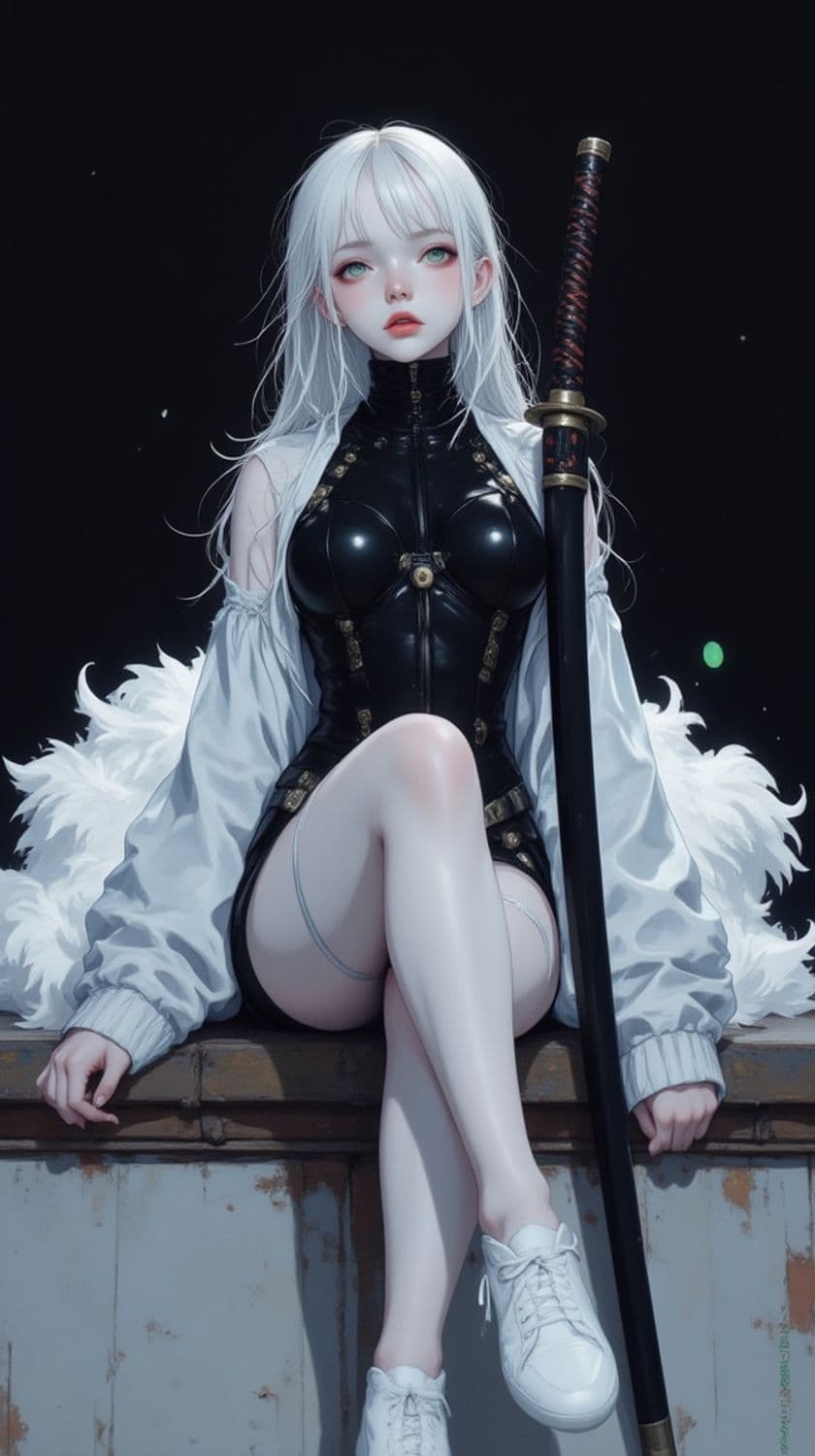 A striking character sits gracefully on a surface, adorned in a sleek black outfit with intricate golden details. She possesses long, flowing white hair and piercing eyes. Her attire is complemented by a luxurious white jacket with fluffy cuffs, and she confidently holds a katana by her side. The background is a stark black, enhancing her ethereal presence, while she wears casual white sneakers, adding a modern touch.