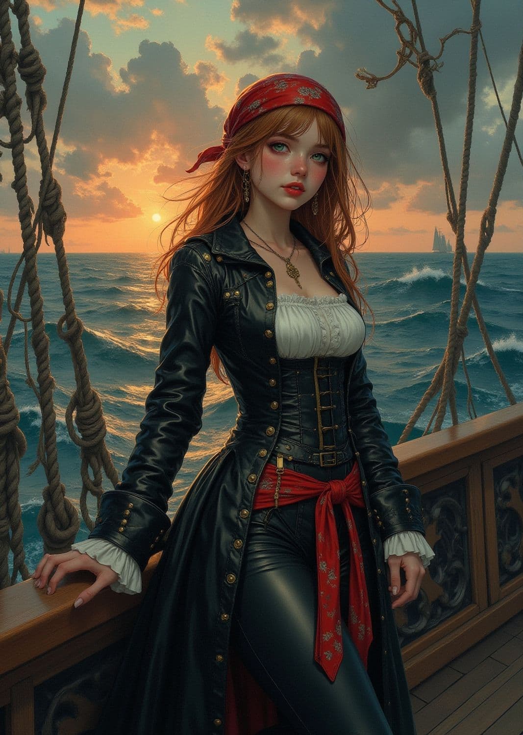 A young woman stands confidently on the deck of a ship during a picturesque sunset. She has long auburn hair, tied back with a red headscarf. Her attire is a blend of elegance and adventure, featuring a black leather coat with gold buttons, a white blouse, and a red sash accentuating her waist. The ocean's waves in the background complement the dramatic sky filled with clouds lit by the setting sun.