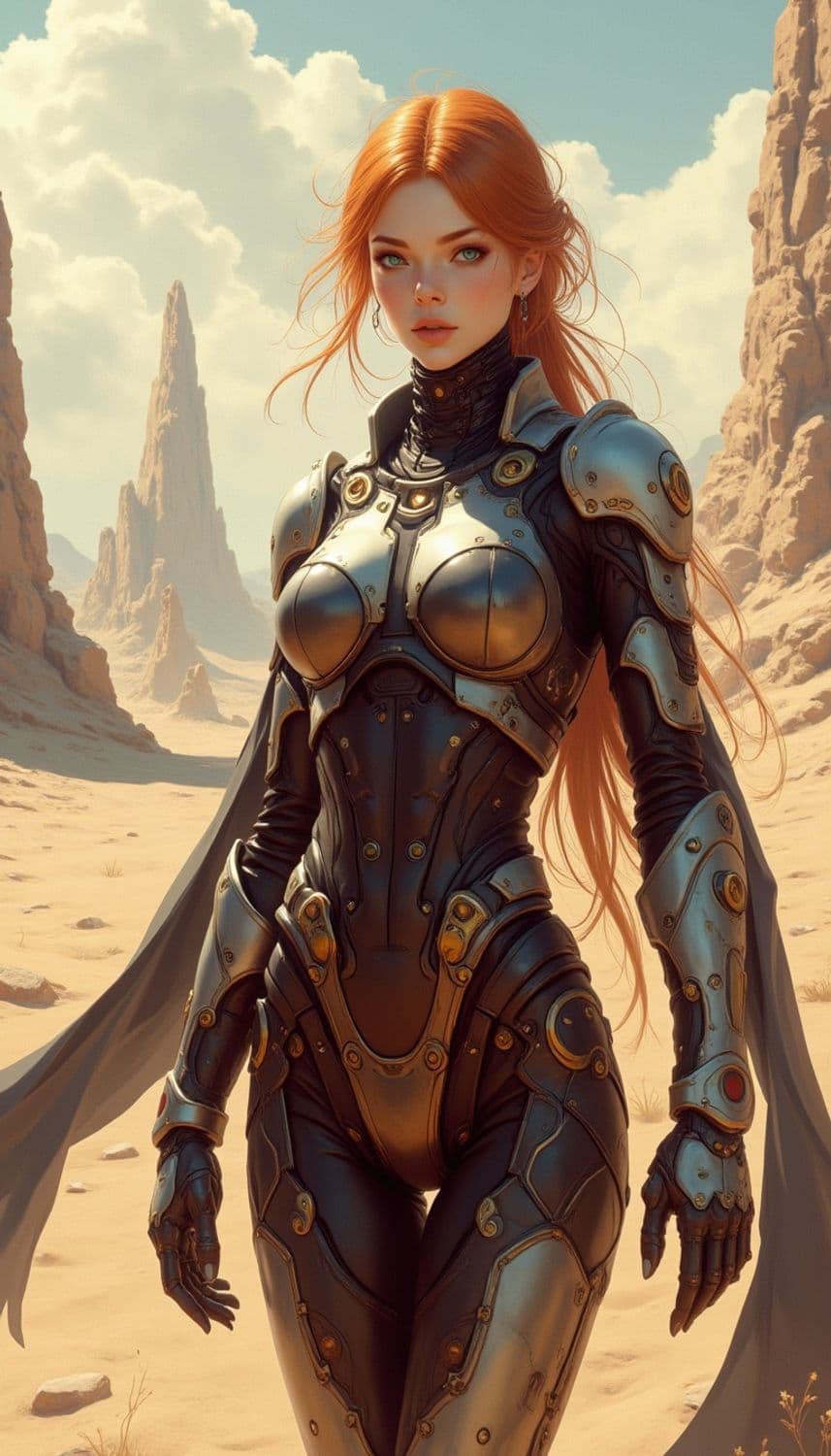 A futuristic female warrior stands confidently in a sprawling desert landscape. She is clad in a form-fitting, metallic armor suit with intricate details, giving her an imposing yet elegant presence. Her striking long, red hair flows behind her, contrasting with the bright, arid desert backdrop. The rocky spires in the background add an element of rugged beauty to the scene.