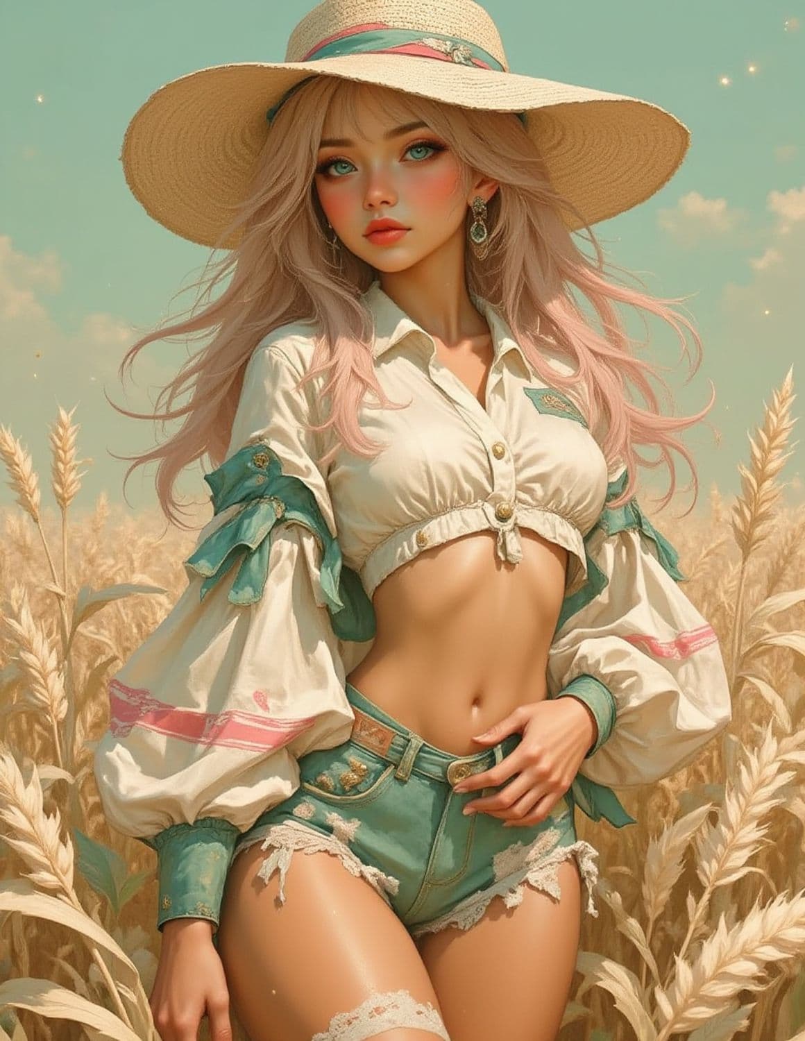A stylized illustration of a woman in a wheat field, with long, flowing hair and wearing a wide-brimmed straw hat. She is dressed in a chic, vintage outfit featuring a cropped blouse with puffy sleeves and high-waisted shorts adorned with lace. The setting sun casts a warm glow across the scene, enhancing the pastel palette.