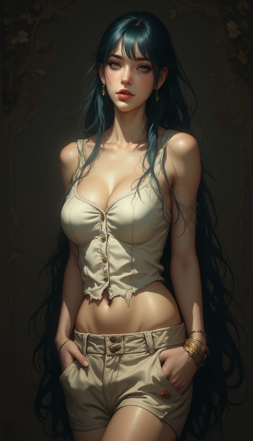 A captivating woman stands confidently with long flowing dark hair. She wears a sleeveless, buttoned top and shorts. Her intense gaze is captivating, and her posture exudes both strength and elegance. The background is softly lit, adding a sense of mystery.