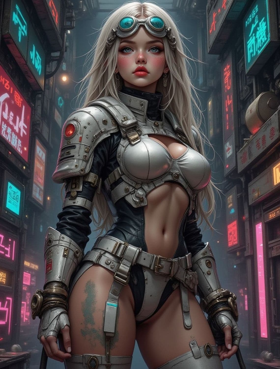 The image features a character with long blonde hair and striking facial features in a futuristic, urban setting. She is wearing a steampunk-style outfit with metallic armor and accessories, including goggles on her head and various belts and straps. Neon signs with Asian characters light up the towering buildings in the background, adding a cyberpunk atmosphere.