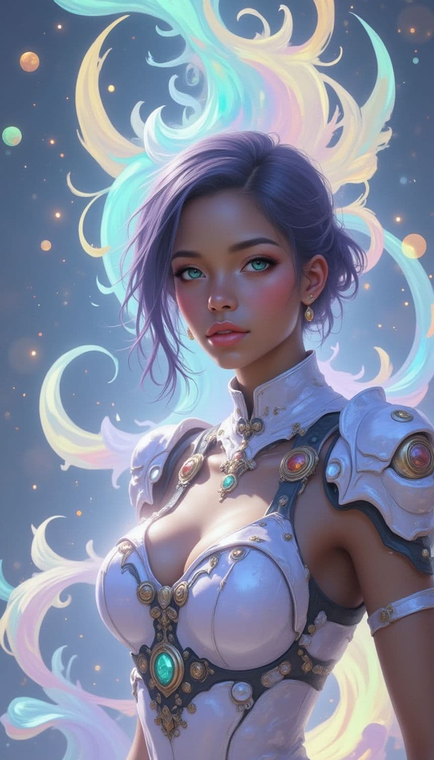 A mystical figure with vibrant purple hair and glowing teal eyes stands in an ethereal setting. She wears ornate armor adorned with gemstones, and gentle swirls of pastel colors create a celestial aura around her. The background is filled with soft, glowing lights and abstract celestial patterns, adding to the enchanting and otherworldly atmosphere.