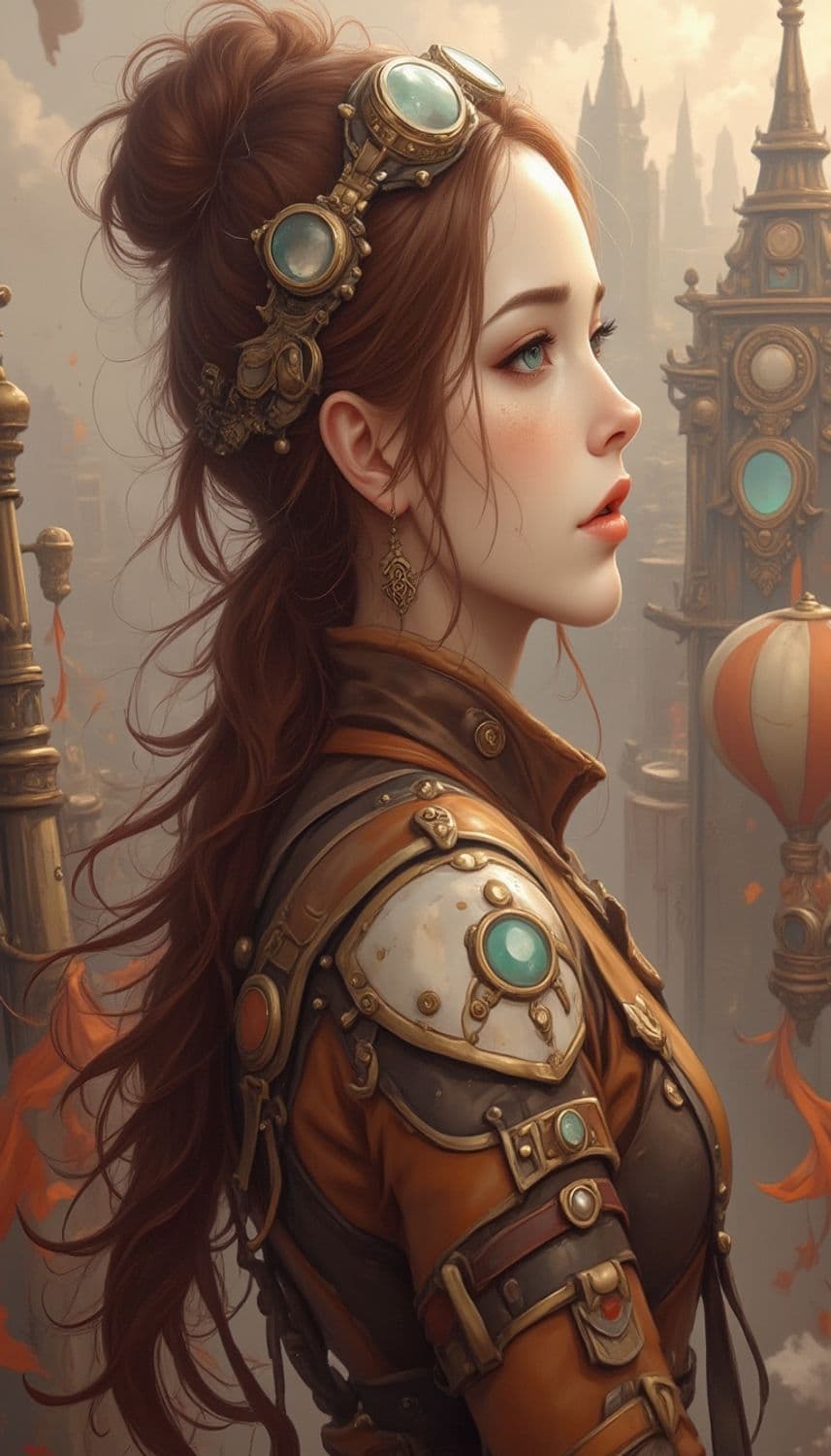 A steampunk-inspired character with long auburn hair tied into a ponytail, adorned with a bronze headpiece featuring large blue gemstones. She wears a detailed brown leather outfit with metal embellishments, including shoulder armor with matching gemstones. The background shows an industrial cityscape with tall, intricate buildings and a dirigible floating in the sky.