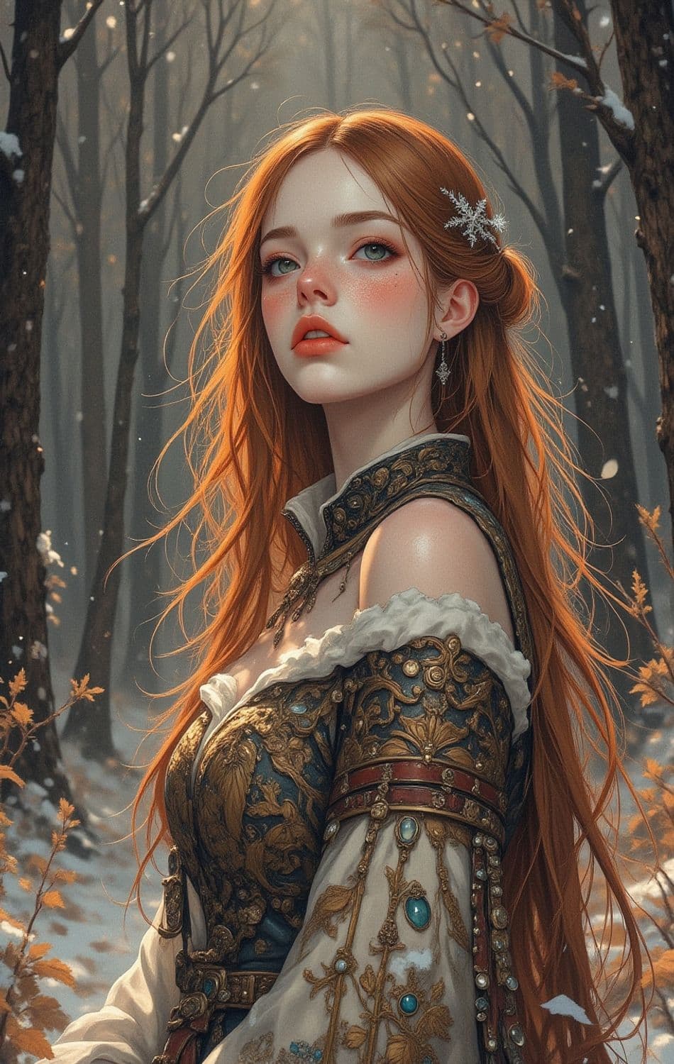 A striking image of a young woman with long, flowing auburn hair and porcelain skin, standing in an enchanted forest with a dusting of snow. Her attire is intricately designed, featuring ornate gold and teal patterns adorned with jewels. Snowflakes gently cascade, accentuating the serene winter setting.