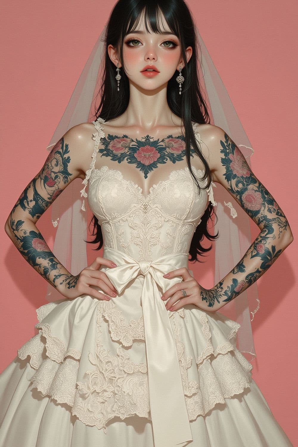 A striking woman with long dark hair stands against a soft pink background. She wears a luxurious, intricate white lace dress adorned with a large, elegant bow at the waist. Her arms and chest feature detailed floral tattoos, adding a bold contrast to her bridal attire. A delicate veil drapes over her shoulders, and she wears dangling earrings.