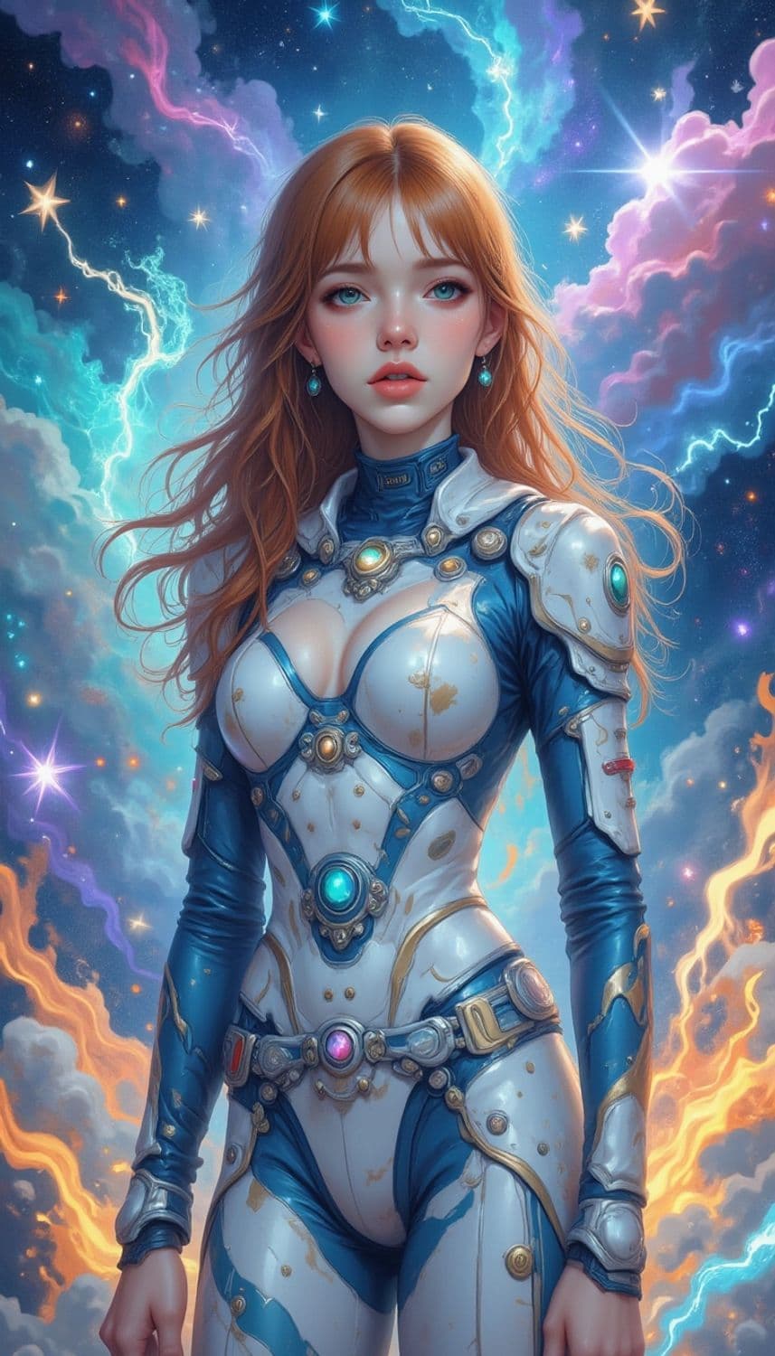 A striking image of a woman in a futuristic suit adorned with glowing gems and intricate designs. Her red hair flows freely against a vibrant, cosmic backdrop filled with stars, clouds, and colorful lightning streaks. The scene is both dynamic and serene, combining elements of fantasy and sci-fi.