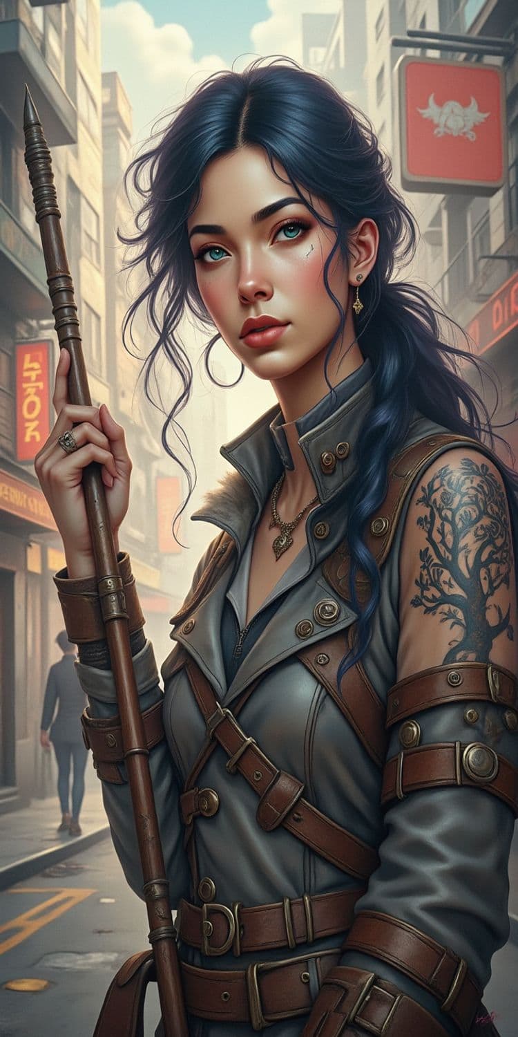 A striking young woman stands confidently in an urban setting, holding a wooden staff. She has dark blue hair styled in loose waves, and her piercing eyes are highlighted by subtle makeup. Her attire is a blend of modern and fantasy, featuring a fitted jacket with leather straps and elegant button details. A significant tattoo of a tree adorns her upper arm, adding an element of mystery. Behind her, a cityscape with buildings and signage creates a bustling urban backdrop.