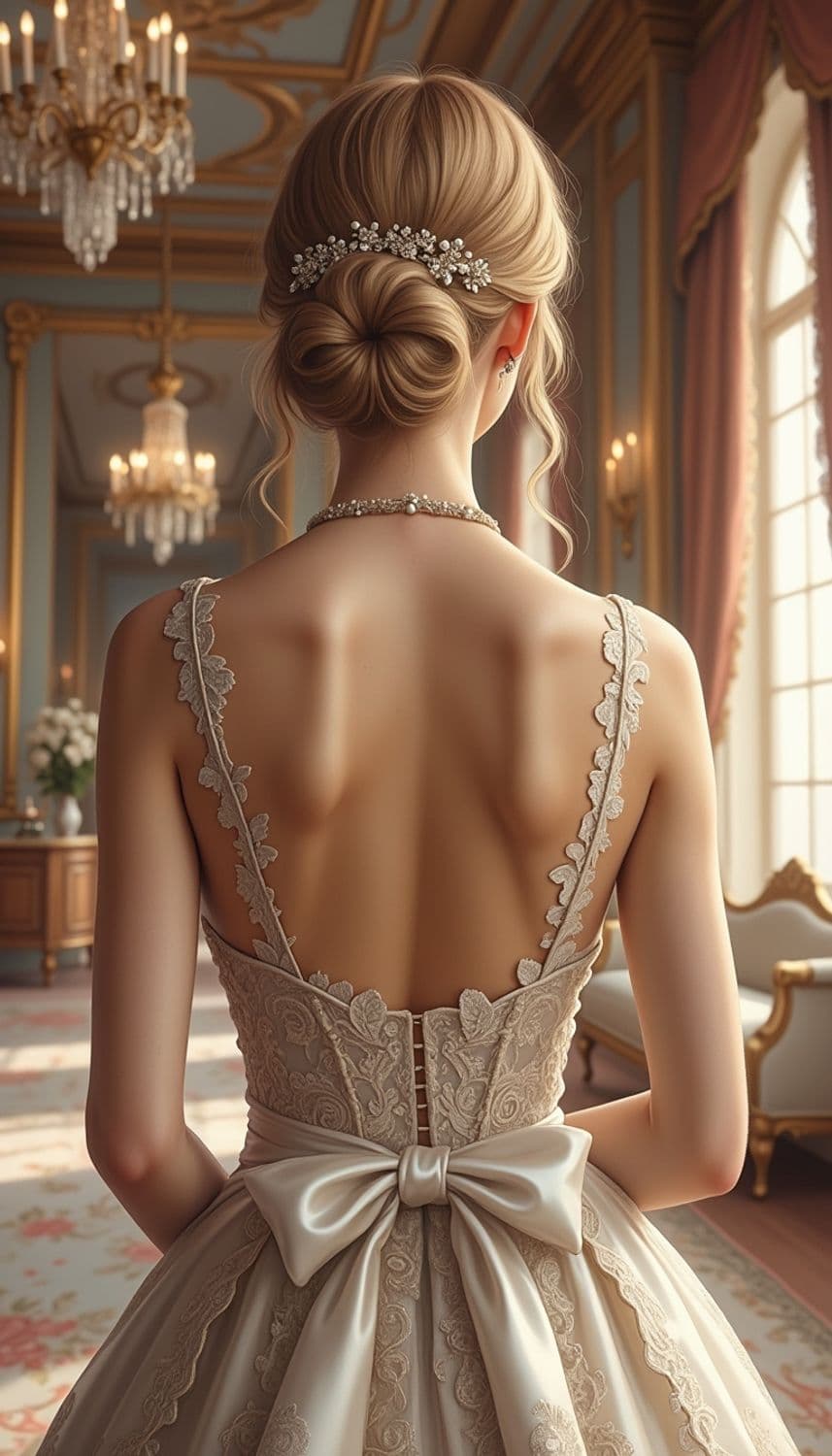 The image portrays a woman viewed from behind in an opulent, classic setting. Her hair is styled in an elegant bun, adorned with a decorative hairpiece with floral or jeweled elements. She is wearing a vintage-inspired, sleeveless dress with intricate lace detailing along the straps and bodice. The dress is a soft beige or cream color, featuring a large bow at the back of the waistline. The background suggests a luxurious room with ornate chandeliers, large arched windows, and rich drapery in warm tones. The lighting is soft, highlighting the textures and details of the dress and the opulent room decor. The style of the image is reminiscent of classical European elegance, evoking a sense of timeless beauty and refinement.